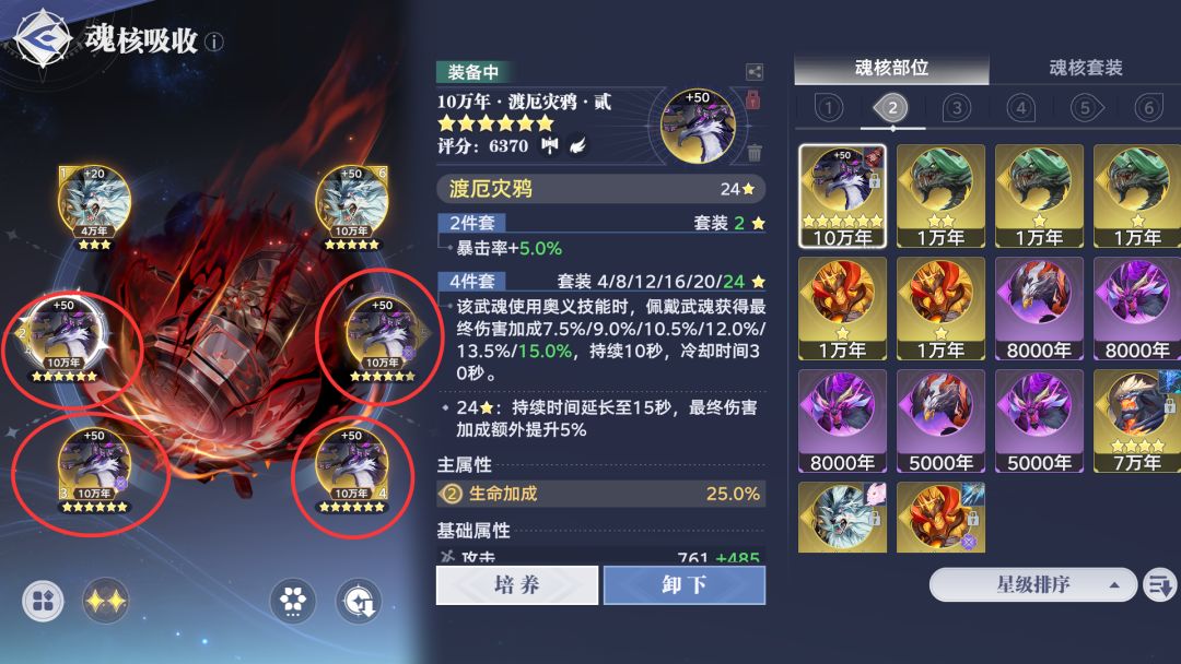 优先凑齐 4个同部位目标魂核本体,先不着急冲年份,专注把星级升到裸3星(无需带花/祝福)!这个操作能大幅提升后续炸星稳定性,避免因本体数量不足导致资源浪费,目前最高可突破至10万年,3星打底是冲高星的关键。
