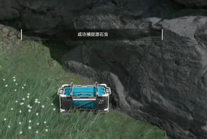先把石头炸开,里面有只源石虫,靠近源石虫点交互会进行捕捉,捉到了就会出现宝箱。