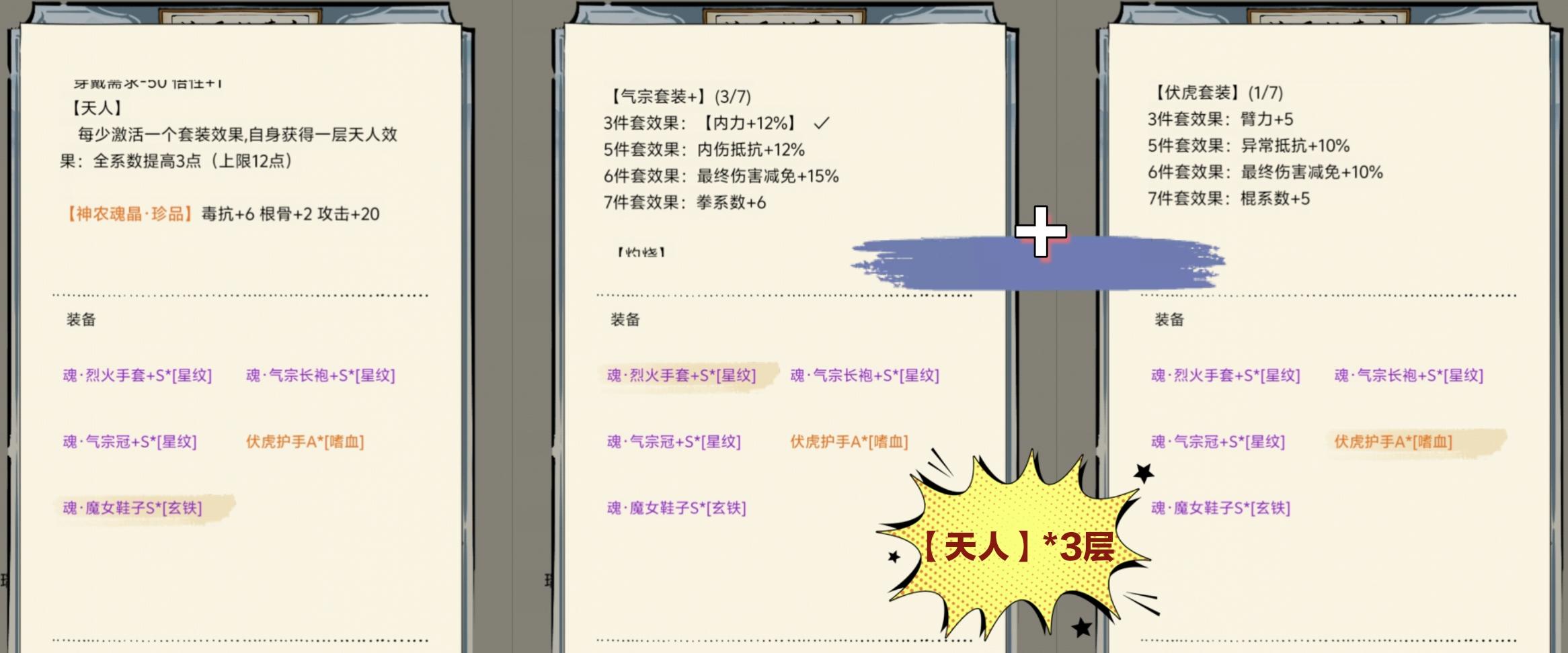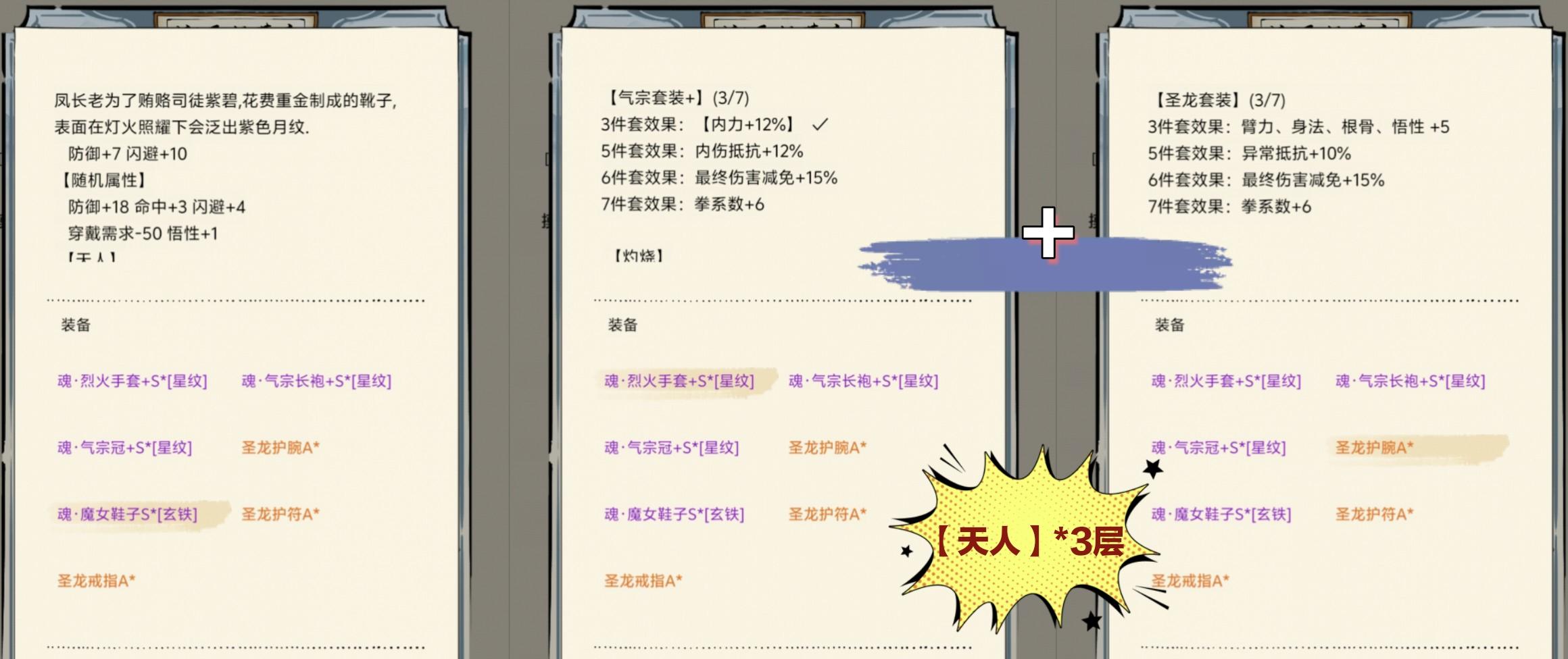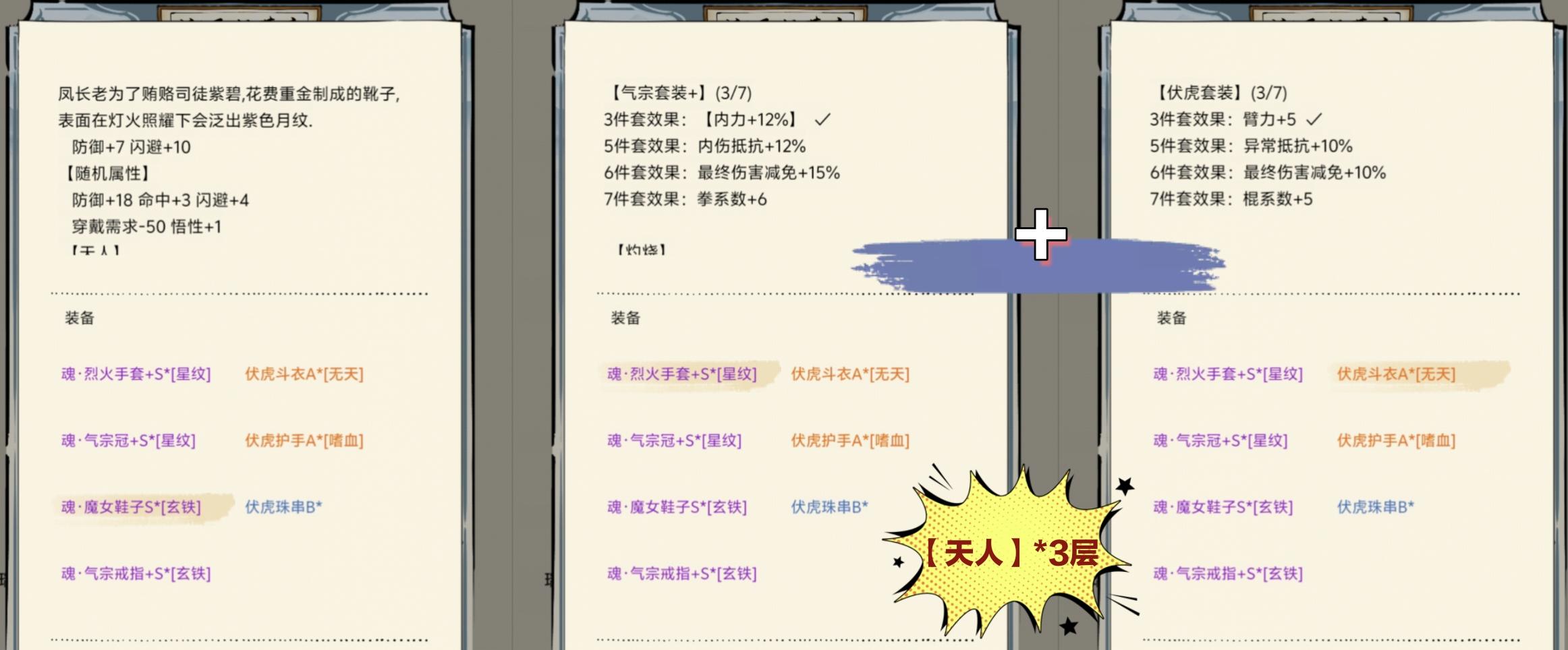 △一些双加成武学(十字、猴棍、三刀)、主输出武学(霸刀、素心)则用王者套+10四维。
