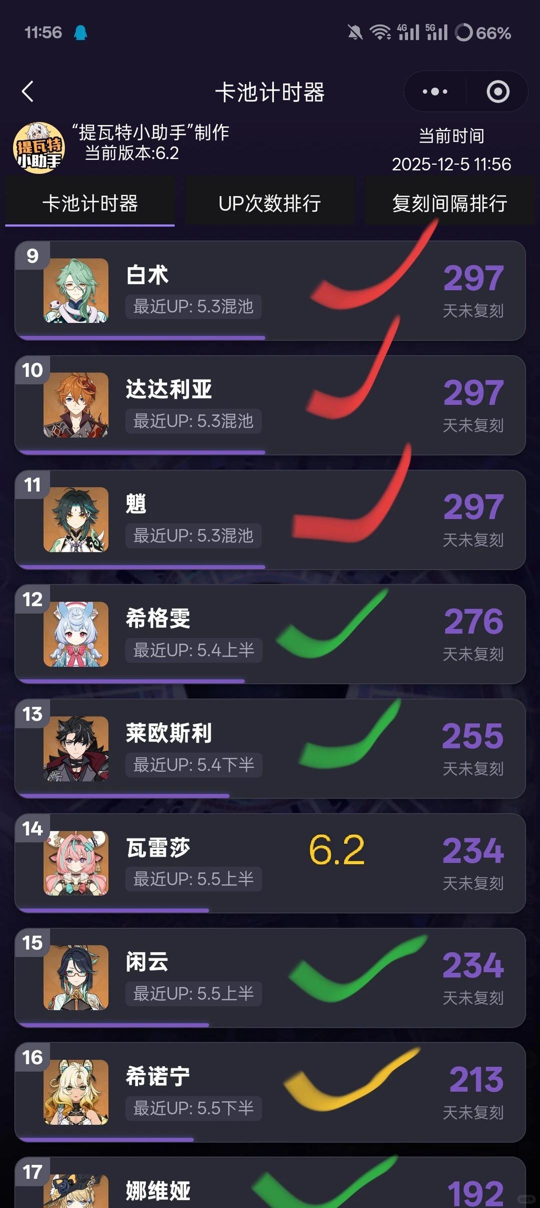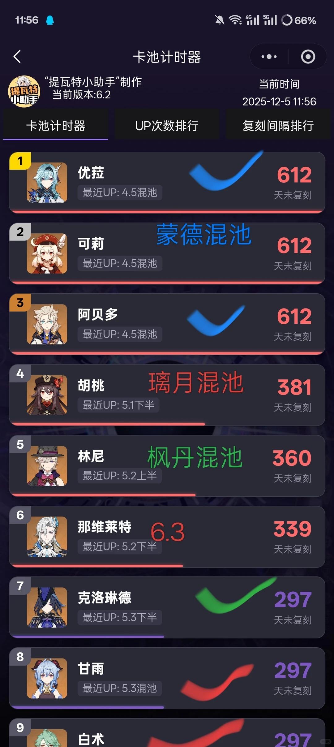 如图所示,此为角色未复刻时间, 前20几乎都是蒙德璃月稻妻枫丹角色, 基本都可入混池一波出 。