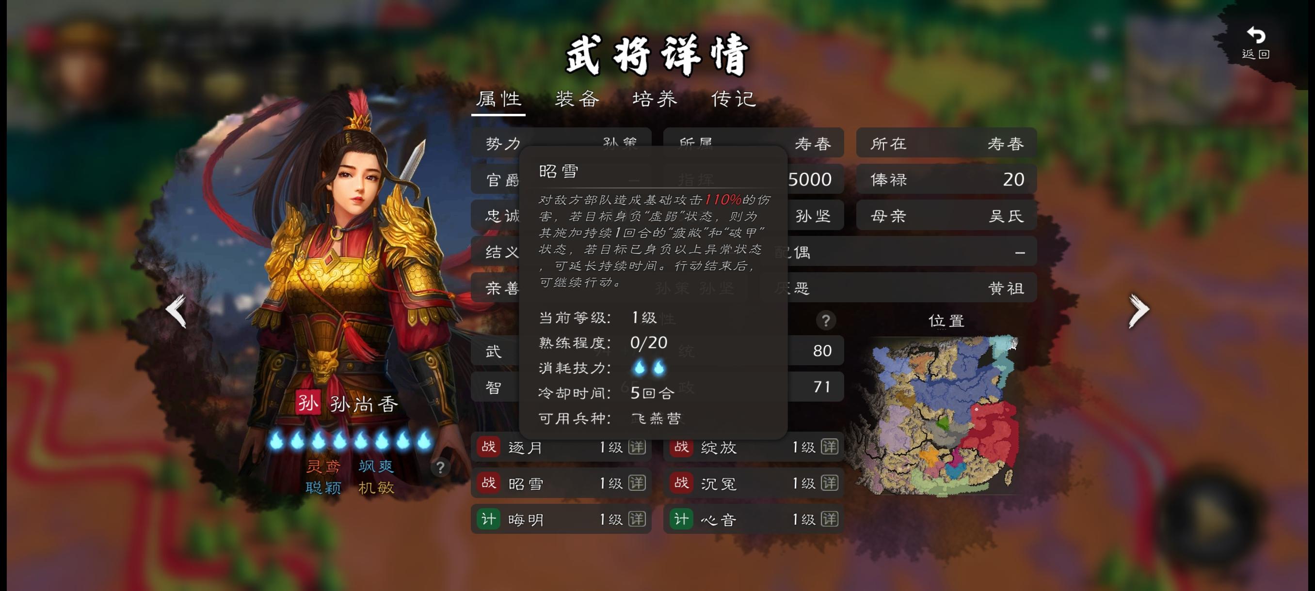 其次是孙尚香,孙尚香存在很多有前置条件才能增伤或再动的战法,可整个DLC,除了孙策的计策“无际之渊”可以给对方加负面状态(你甚至还要担心满级的无际之渊不要把对方的部队全打死,不然就没有身上有负面状态的敌方军队了。),几乎就没有其他加负面状态的计策和战法了。但在很久以前,AI的战争逻辑就把解控放在第一位了,很多时候,AI只要吃到了负面状态,就会第一时间释放解控技能。也就是说只有在最理想的状态下,孙尚香才能打完(逐月-昭雪-沉淀)这三个技能。然后因为“无际之渊”有5个回合的冷却,孙尚香就随着孙策技能的冷却,陷入5个回合的“无力期”。这些设定让孙尚香不能脱离孙策,完全是孙策的挂件。
