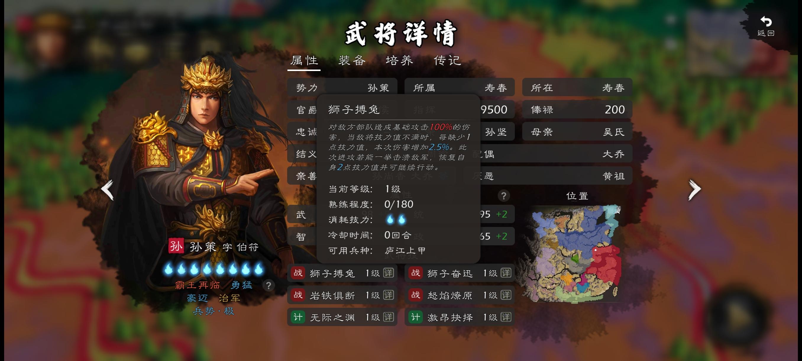 还有孙策的“狮子搏兔”战法,升级熟练度要求实在太高了,而且再动还存在击溃敌军的前置条件。(虽然马超神枪闪升级的熟练度要求也很多,但神枪闪可是无条件无冷却的再动,升级肯定要更快。)