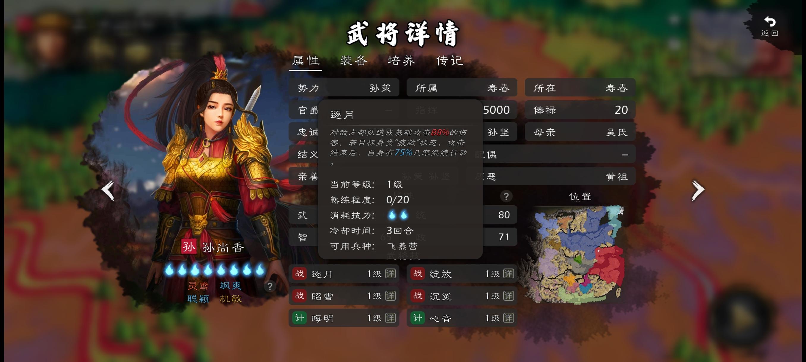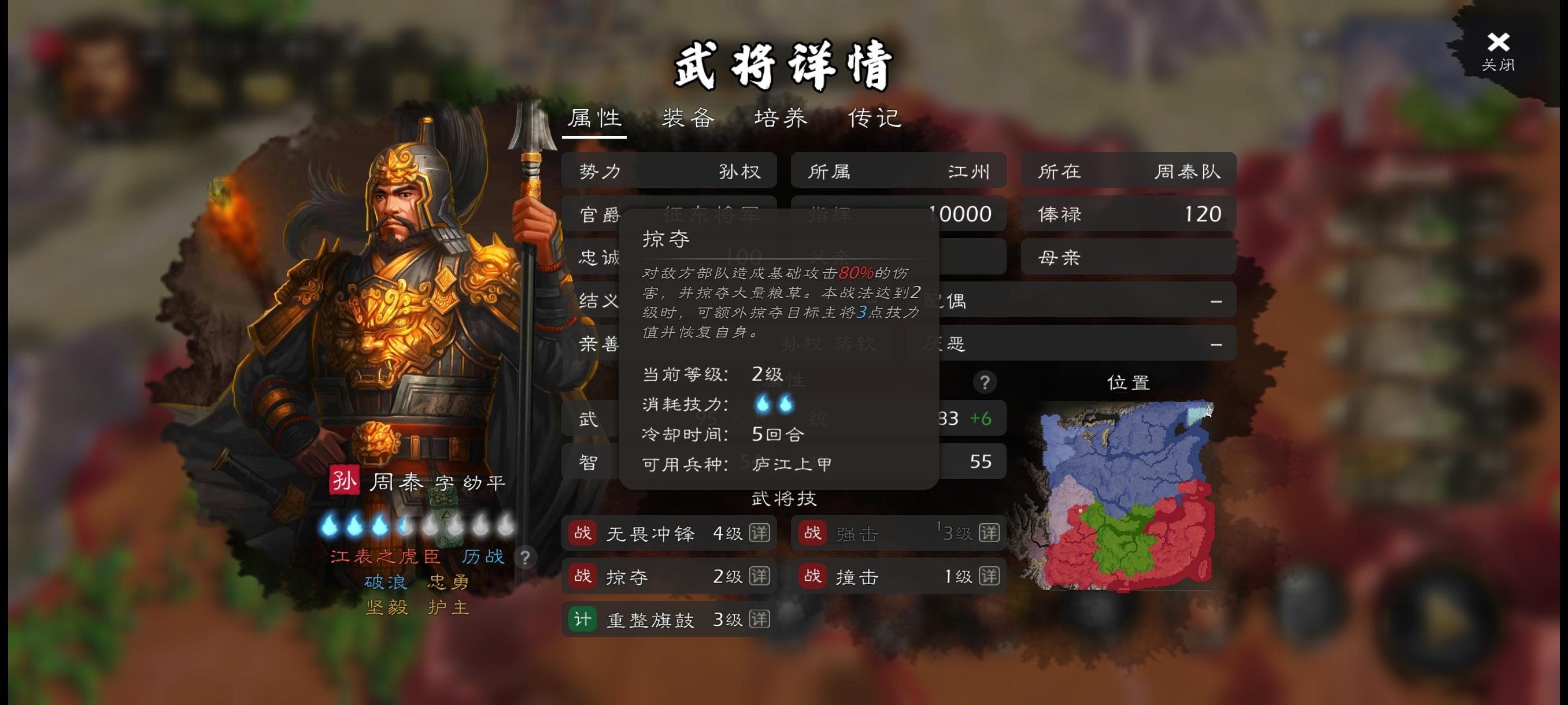 最后,掠夺这个技能太鸡肋了,满级2级,伤害低,消耗4点技力值恢复3点技力值,不能再动,没有给对面放负面状态。只有一个掠夺对方粮草,但近战骑兵会缺粮草吗?随便灭对方一队就会补给到粮草吧!根本用不到掠夺对方粮草的效果。