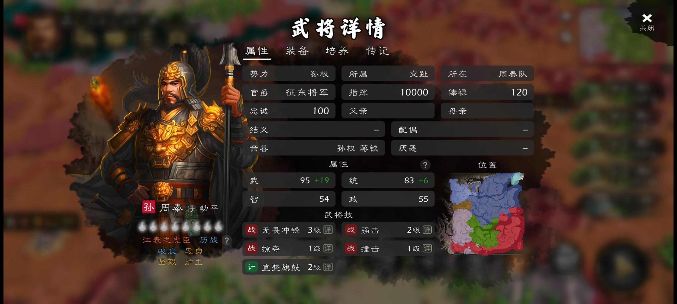 然后是周泰,首先DLC周泰真的太缺蓝了,由于江表虎臣的特性会使战法不进去冷却,撞击用完后可以再动,无畏冲锋击溃敌军后也可以再动,三者叠加,就会出现技力值用光了,所有技能都没进冷却。