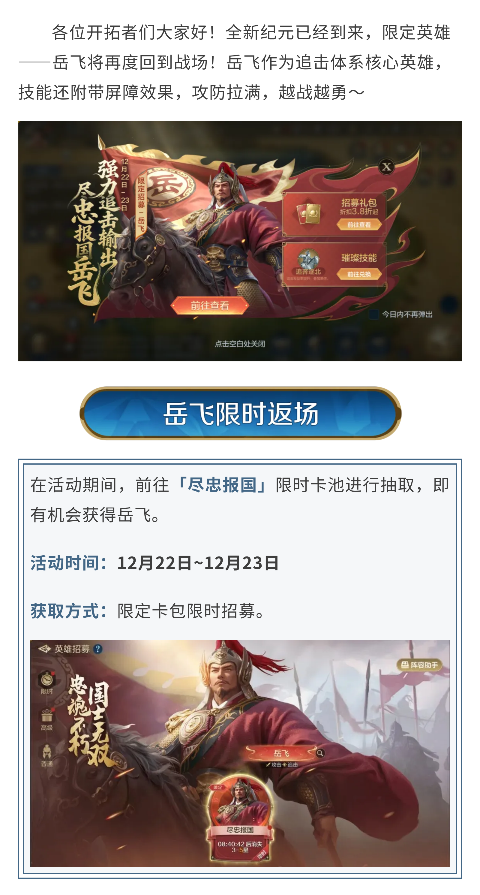 新活动资讯丨忠魂不朽,国士无双,限定英雄岳飞返场!