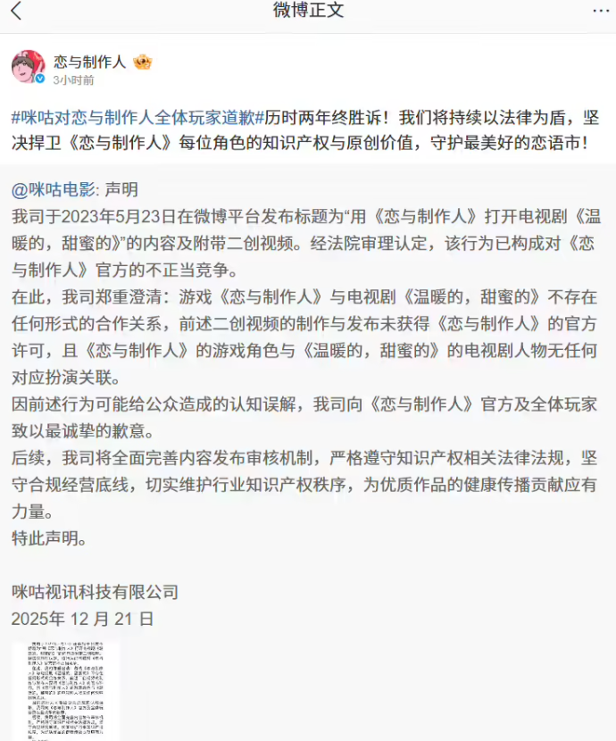 今日,咪咕视频电影频道官方微博发布正式道歉声明,就2023年5月23日发布的侵权内容向《恋与制作人》官方及全体玩家致歉。声明显示,经上海知识产权法院审理认定,其当日发布的标题为 “用《恋与制作人》打开电视剧《温暖的,甜蜜的》” 的内容及附带二创视频,已构成对《恋与制作人》官方的不正当竞争。