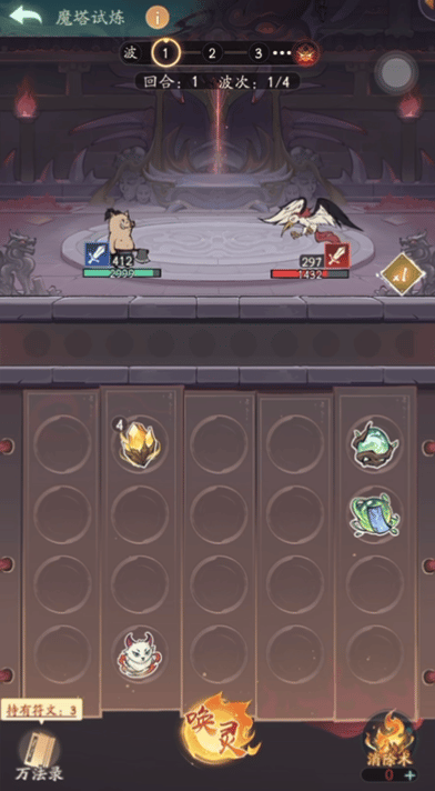 道友将使用万法录与妖魔进行对战,每次“唤灵”后,将从万法录中拥有的符文随机20个到盘面上,并根据符文触发符文效果,生成攻击倍率给道友加成后对怪物造成伤害!