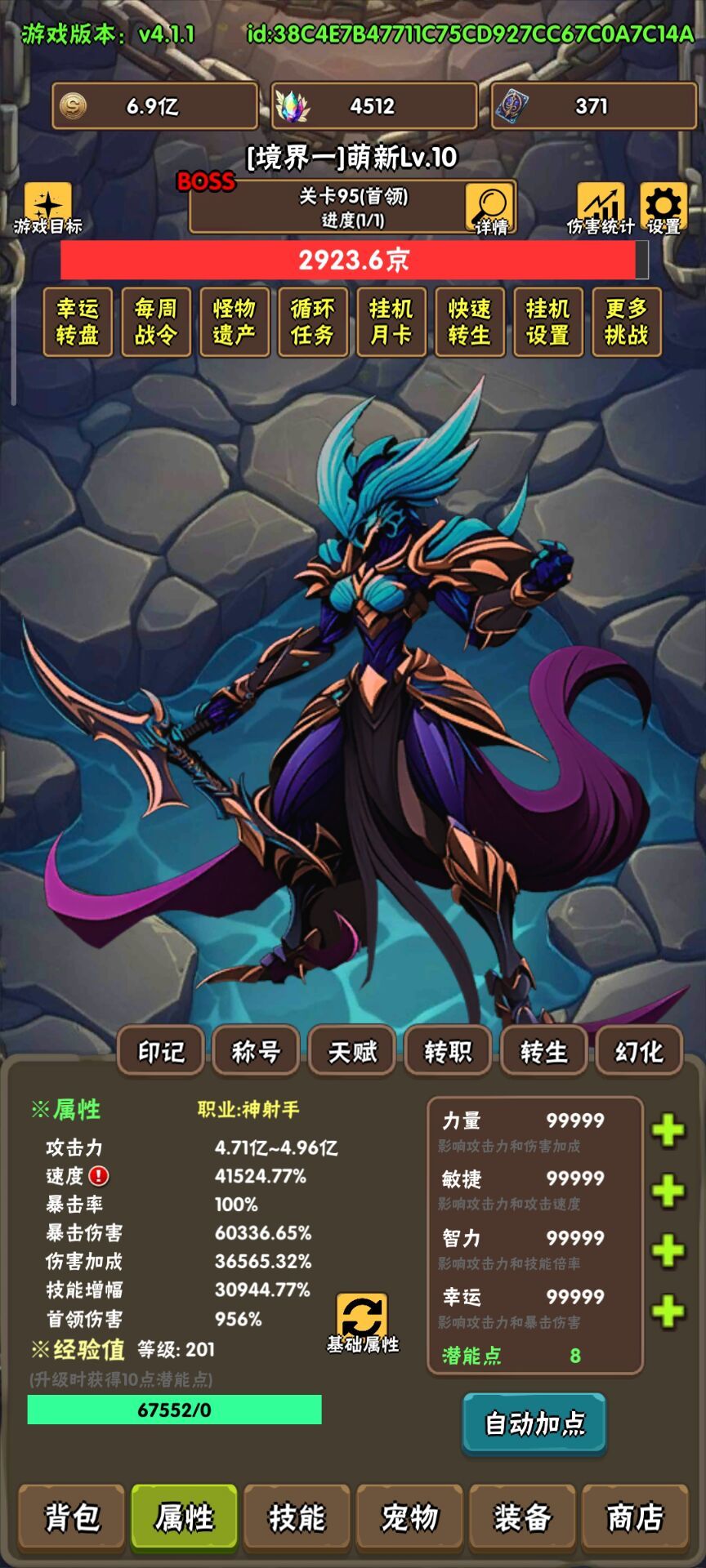 ③天赋怪物、初始金币、金币加成强化、主角首领伤害强化点满,极限力:敏:智:运=3:4:1:1比例用光天赋点,然后点击潜能果实使用,右上角智能使用查看自己的所需的潜能果实。(人物天赋加成太少,点了没啥用,不如潜能上限)