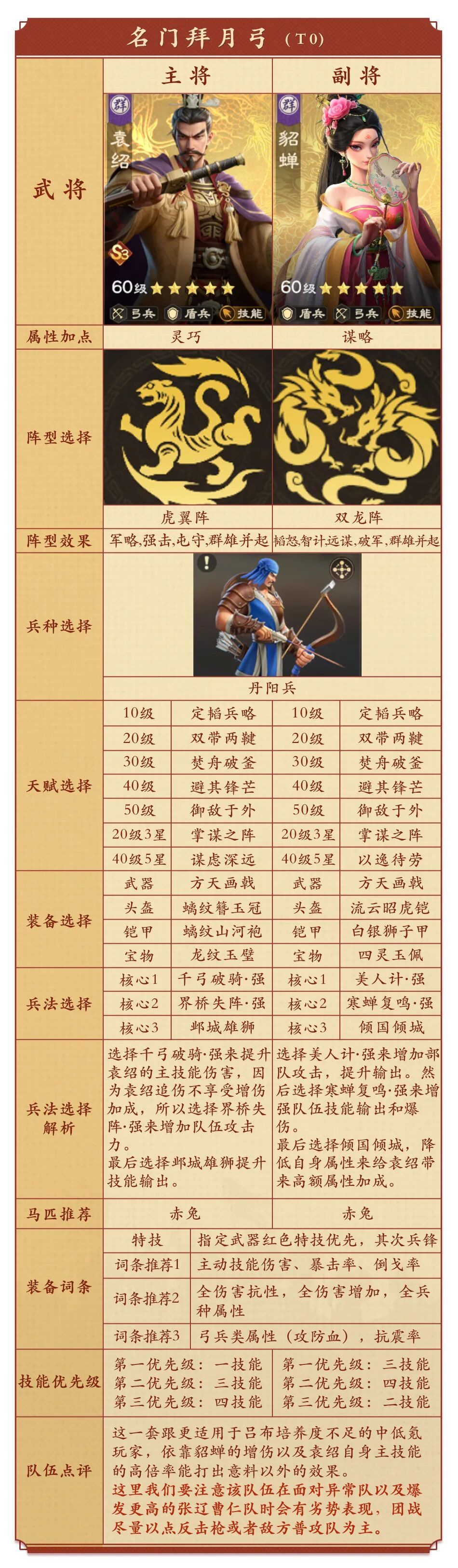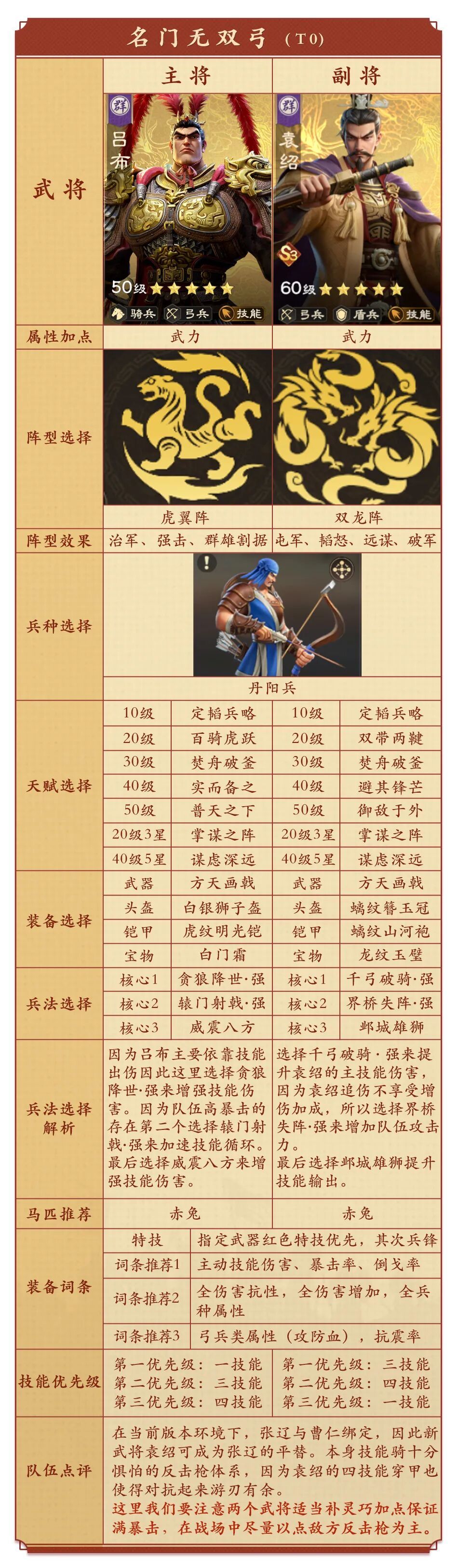 - -适合搭配技能体系的队伍,建议作为辅助武将,因当前环境来说,曹仁和张辽基本是绑定的,所以袁绍这里来搭配吕布等武将组成技能爆伤队伍; -因袁绍技能伤害系数较高也可作为主输出搭配貂蝉等辅助武将。