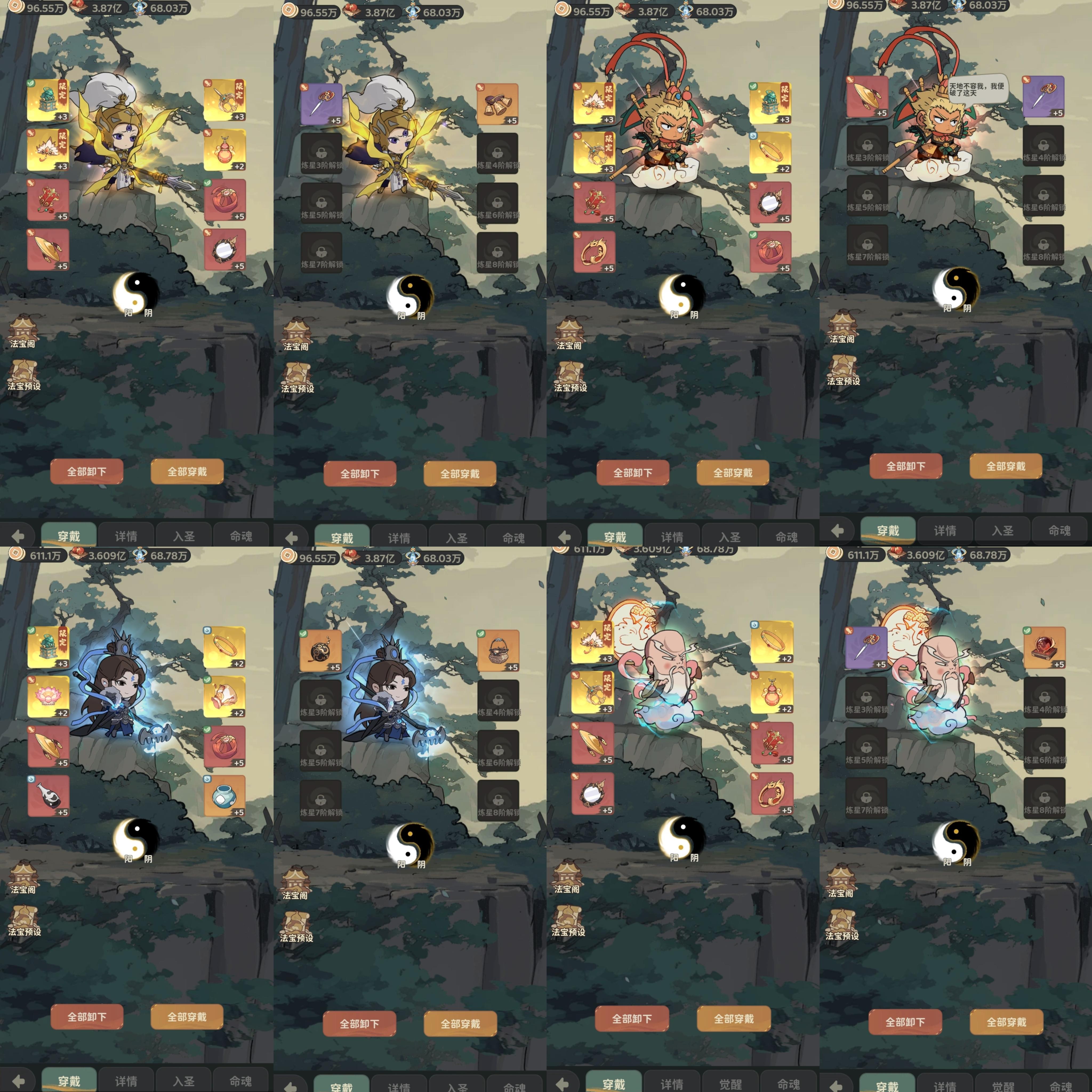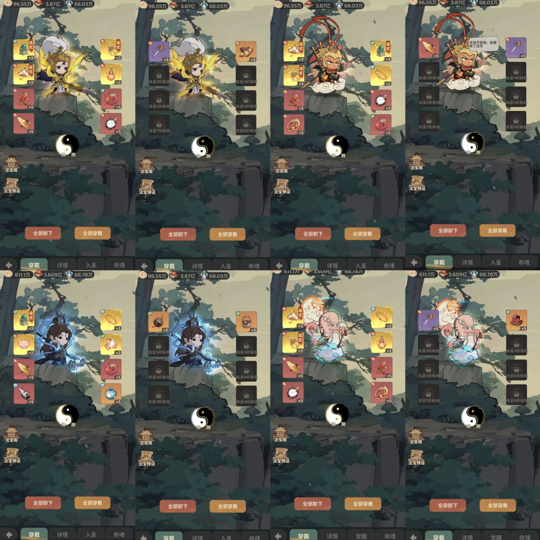 注:没10转的真君最多越战2.2倍,为了避免频繁更换法宝等各方面东西消耗耐心,先观察装备关卡战力是否达到你的1.5—2倍,如果高于这个数值,在真君,大圣没10转,白骨没5转,没皮肤的情况下,尽量不要去闯关了,浪费时间。然后法宝可以预试方案,一键穿戴也让人省心