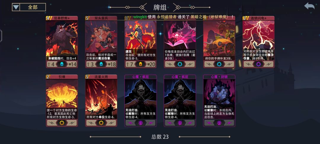 理想卡组:过牌(2~3张)群伤魔法(2~3张)心魔(3张)生物装备(1~2张)英雄装备(3~4张)卡组厚度(22~24张)