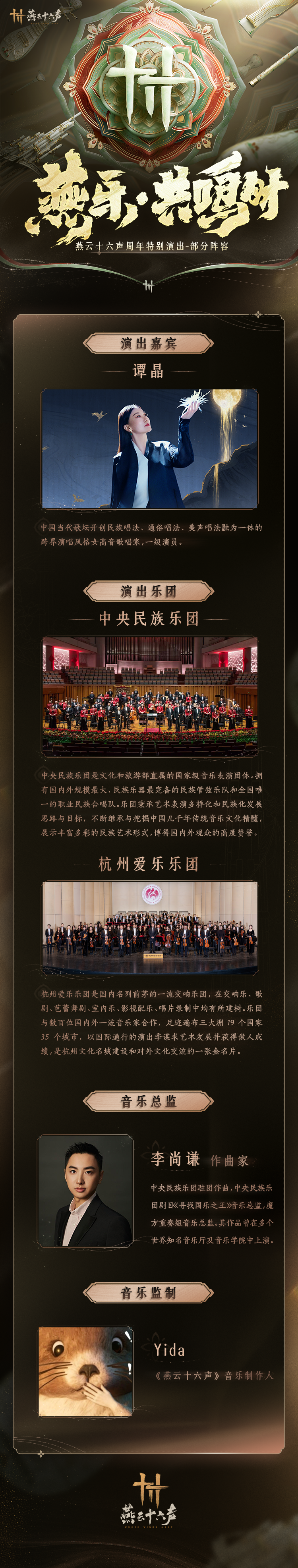 本次演出,我们也有幸与著名歌唱家谭晶、「中央民族乐团」、「杭州爱乐乐团」、各舞蹈及演出团队的艺术家们倾情合作,共奏燕乐。