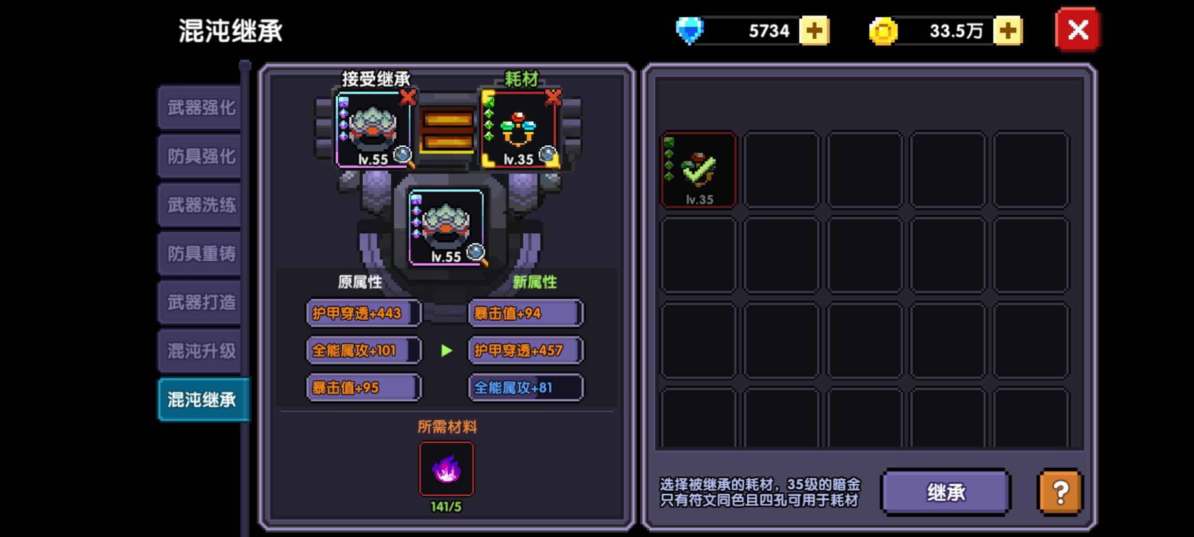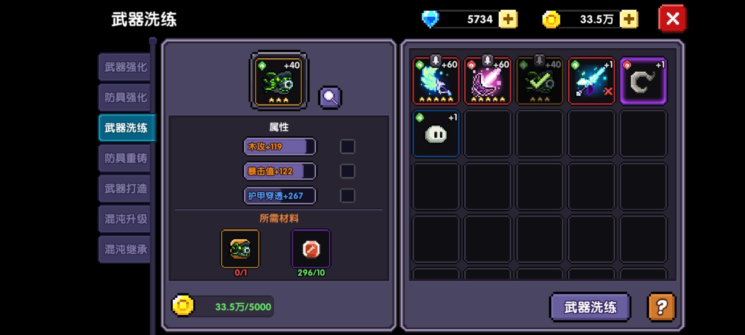 1.武器副属性,可以采用分解重复武器洗练词条,建议洗出紫护穿就停手,前期没多少洗练石
