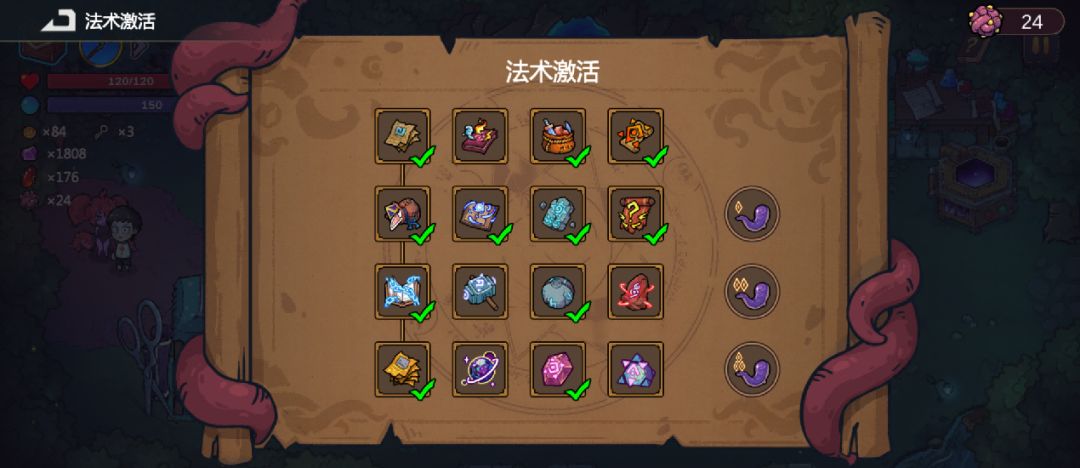 另外,重铸房与商店还有概率刷新隐藏房间,重铸房的隐藏房间内有一台法术四合一机器,可以将四个同品质法术、同星级的法术,合成四个素材其中一只的法术并加+1星级,虽然四合一有些亏,但在部分时刻也是可以使用的。