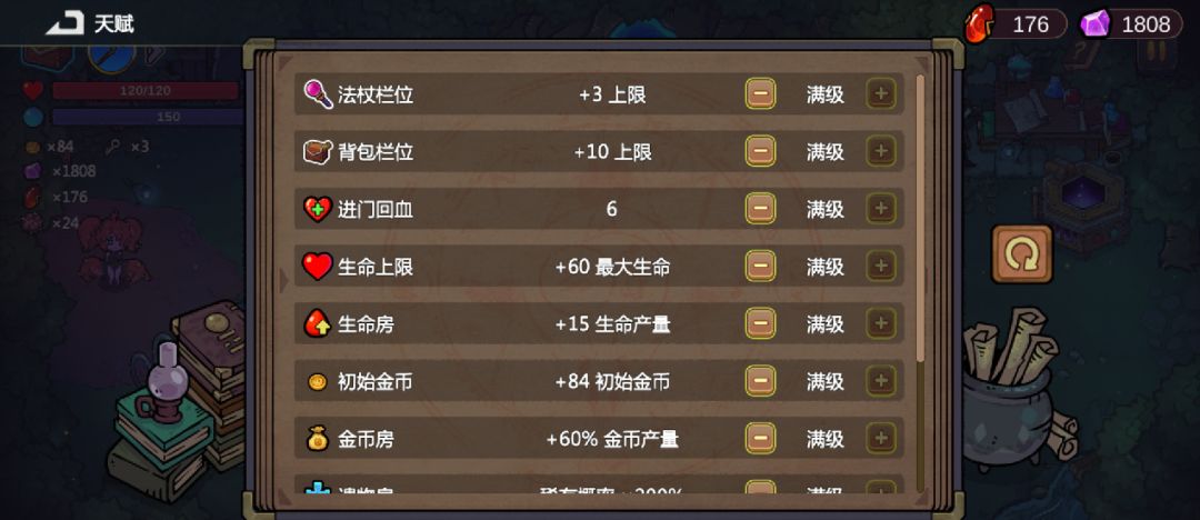 天赋方面,我推荐优先升级基础的法杖栏位、背包栏位、进门回血和生命有关的内容,毕竟活着才有DPS!更大的背包也可以让我们尽可能多的积攒各种法术,更迟进入重铸房。等到古神之血足够解锁更多天赋时,再升级【法术】【遗物】的出现概率助力追梦!