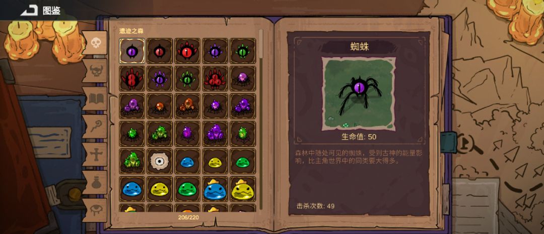 【图鉴】功能则需要先推进主线剧情,然后在营地右上角NPC【研究员利恩】处解锁【百科全书】,即可在营地中查看【百科全书】或在暂停后点击【图鉴】查看所有解锁内容,获得道具完成游戏后即可将其加入【图鉴】。【图鉴】不仅可以让我们查阅法术、遗物、法杖等道具的效果,还可以查看击败怪物、首领的次数;不同等级法术的效果(需获得过对应等级);法杖的属性与效果;遗物的获取次数与最高等级;药水的使用次数以及诅咒的获得次数,内容非常详实。