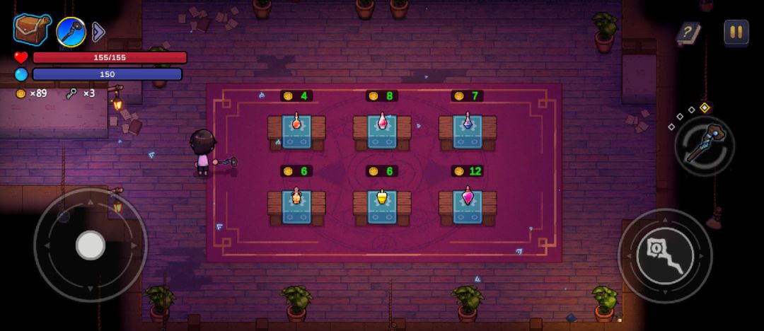 商店会随机刷新7个物品,必定包括1个法杖和3个法术,剩下的3个道具会随机生成生命值、护盾或钥匙。法杖为本章节可掉落且本次游戏过程中未获取过的任意法杖,一些强力法杖如【永春嫩枝】【轰击辰星】可以在对应章节的商店获取,部分带有强力法术的法杖如【老魔杖(自带阿瓦达啃大瓜)】【起源之星(自带奥数新星)】大家也可以“买椟还珠”,就当花钱买法术。