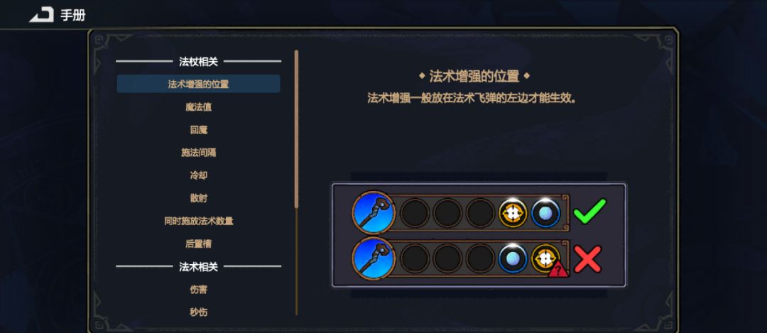 除了在游戏外查询各种资料,游戏内也有相应的【手册】与【图鉴】。在游戏过程中,点击右上角暂停旁边带着“小问号”的“书本”图标,即可进入【手册】查询官方为我们准备的各种介绍,例如最基础的【法杖相关】与【法术相关】,部分内容还非常贴心的有视频演示。只要认真看过【说明】中的各种介绍,就可以算基本入门魔法工艺了。