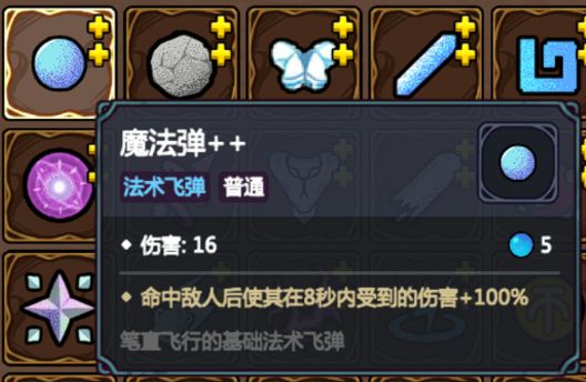 朴素的【魔法弹】在++以后,可以给受击目标100%的易伤效果,而且前期如果选择初始套装,默认就会获得一些魔法弹,也更方便后期合成。