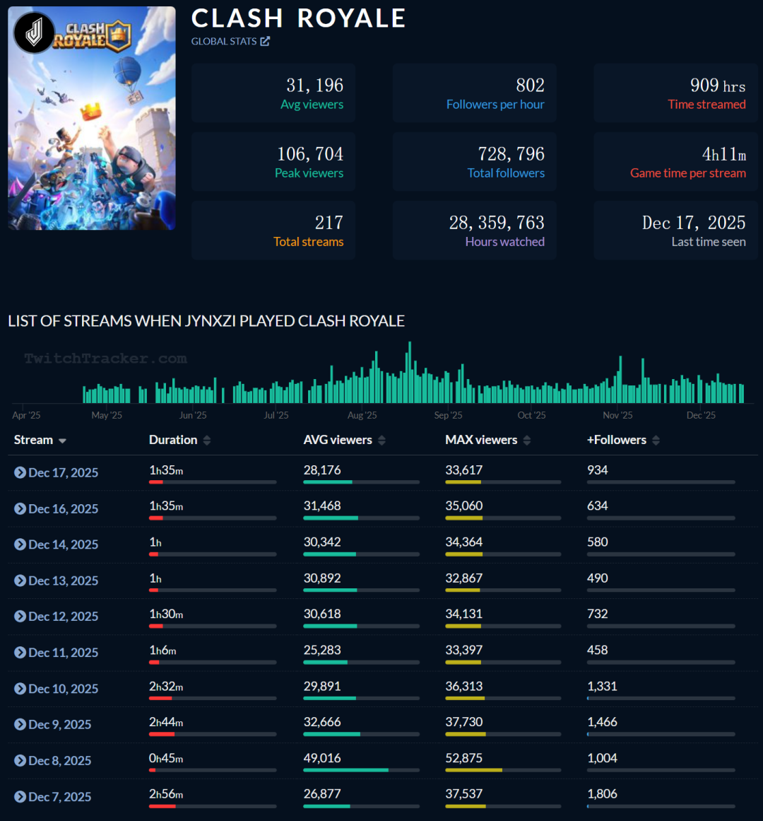 Jynxzi4月底开始直播《皇室战争》,至今仍在天天直播
