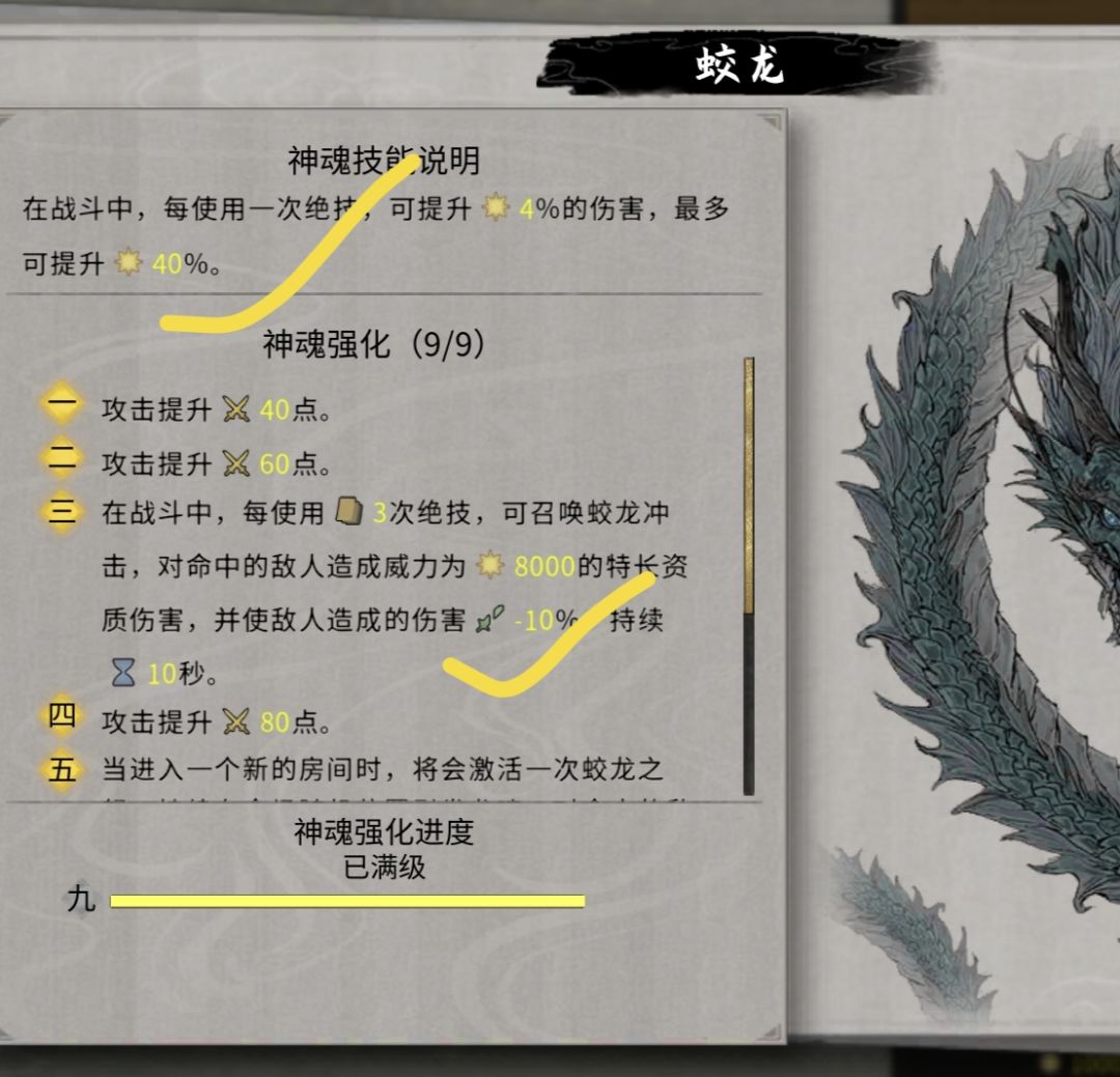 神魂:蛟龙,增伤40%+减伤10%(蛟龙能快速结束战斗,怕是选玄龟也可)