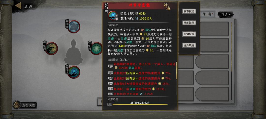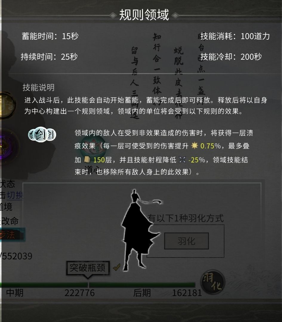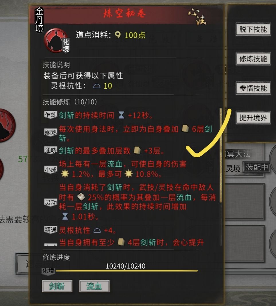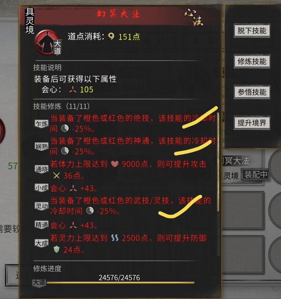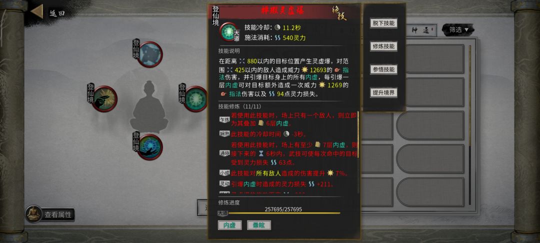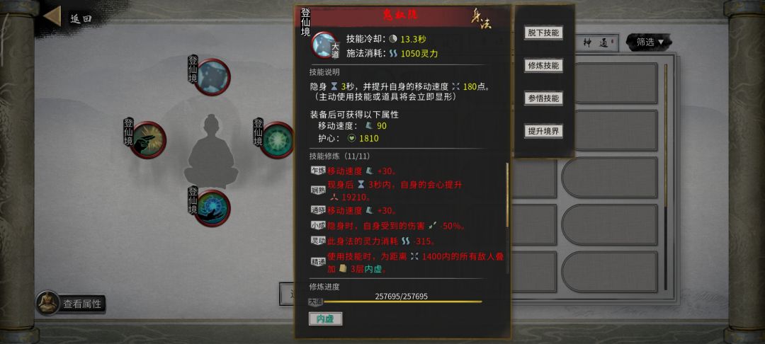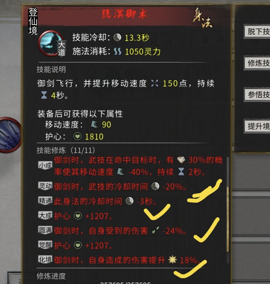 劲,经(登仙后用渡江云-20%技能冷却+道心宰御-10%技能冷却) 式,录(登仙后用破阵子,防御可以转化为攻击) 决是哪个有护盾用哪个