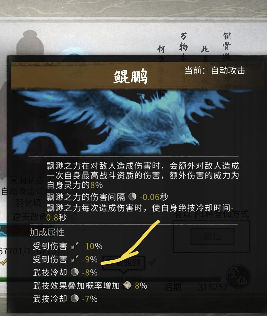冥羽:鲲鹏,主要伤害来源是绝技,所以选了鲲鹏,上面选了增伤,就再来点减伤+19%