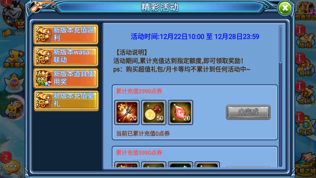 ps:购买超值礼包/月卡等均不累计到任何活动中~