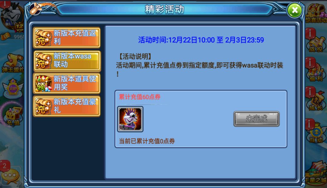 活动期间,累计充值点劵到指定额度,即可获得wasa联动时装!