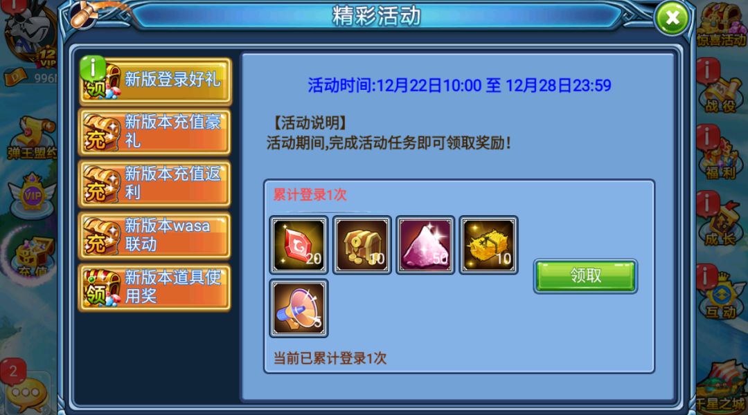 登录1次:神强化石*20,金币箱*10,星尘*50,坐骑草料*10,跨区大喇叭*5