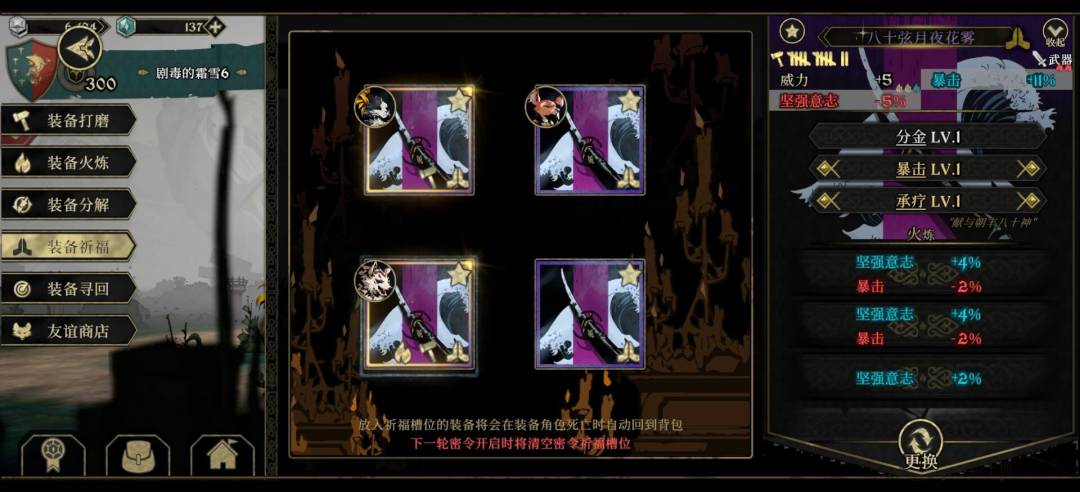 2.火炼:萌新别乱炼会负提升(比如你15%暴击的首充刀炼成11%暴击,可以参考图片,一般是多余不用的装备才去火炼,而且出好东西的概率很低,一般也是大后期没提升才去玩的)