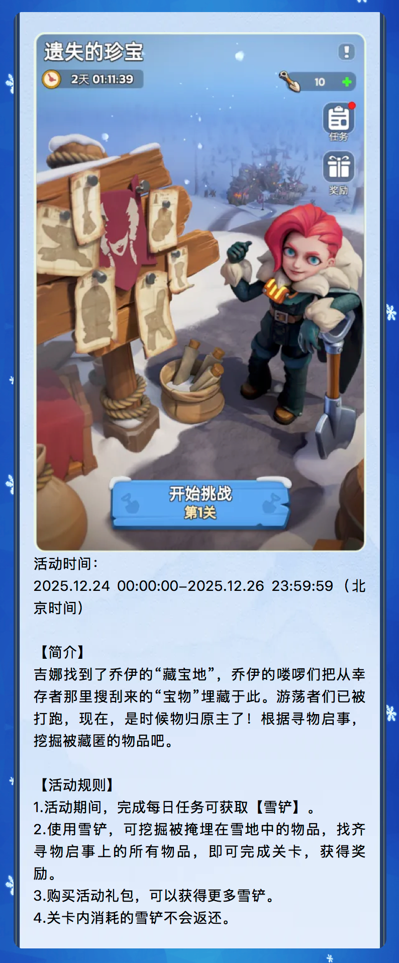 “遗失的珍宝”活动起止时间为2025年12月24日 00:00:00-2025年12月26日 23:59:59(北京时间),不要错过哦。