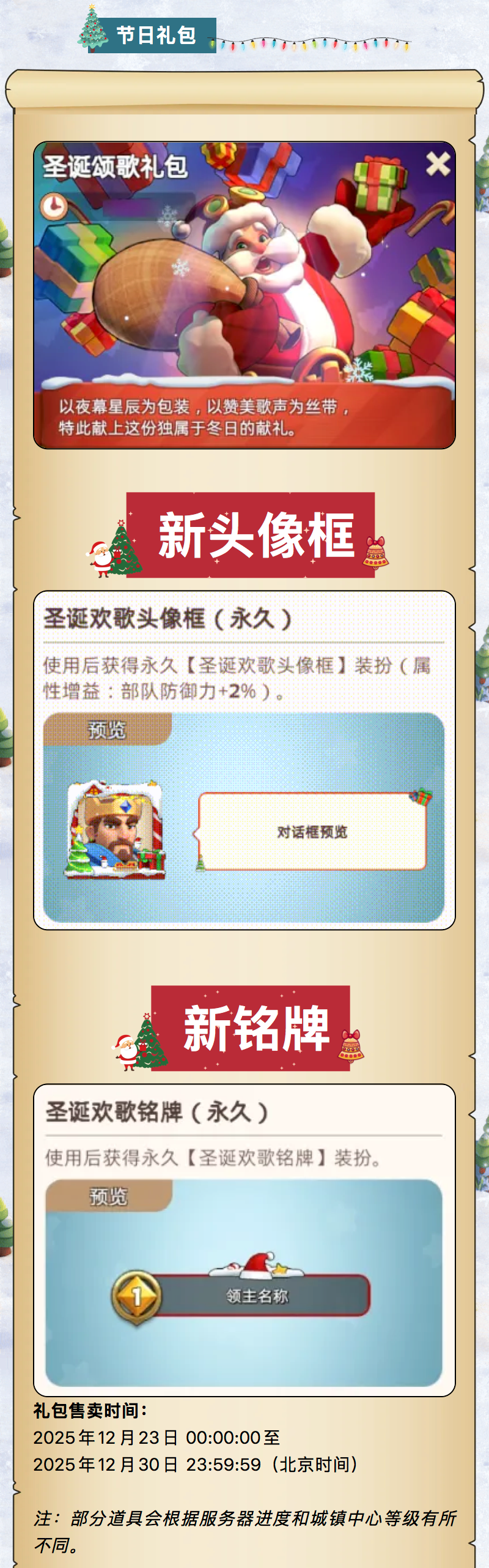 *圣诞庆典将于2025/12/23 00:00:00~2025/12/29 23:59:59北京时间(部分活动将持续至2025/12/30 23:59:59北京时间)于符合条件的王国开放,更多内容详见游戏内活动规则。