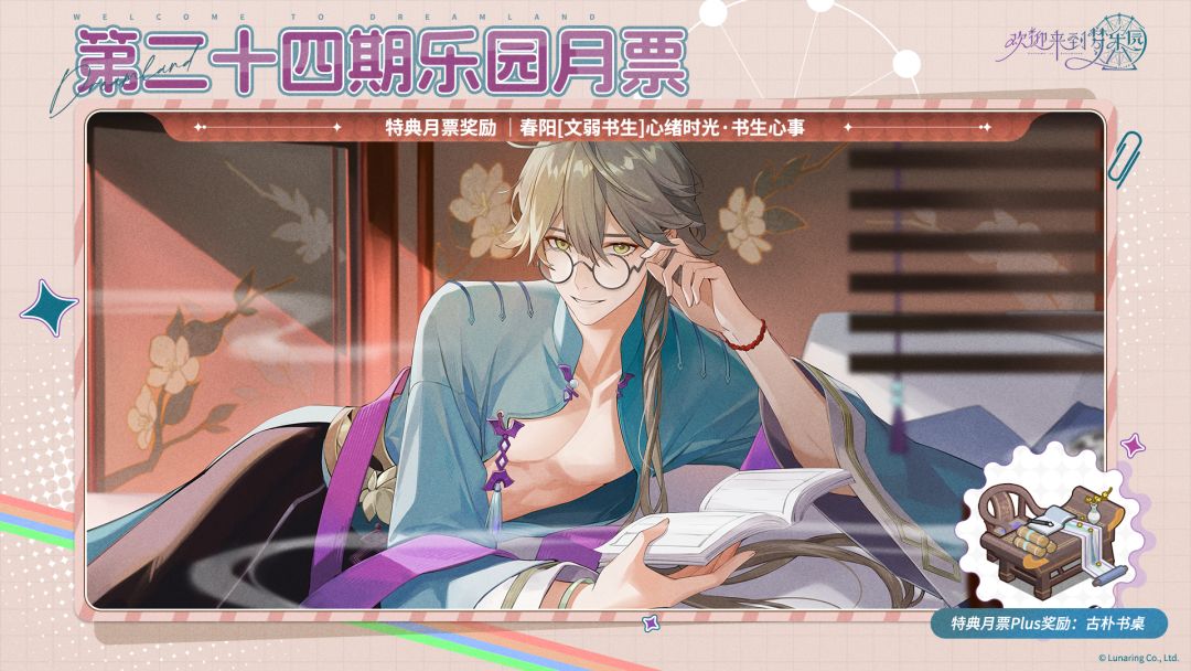 -核心奖励内容:解锁乐园月票进阶奖励、春阳[文弱书生]心绪时光书生心事、春阳[文弱书生]专属互动家具「古朴书桌」