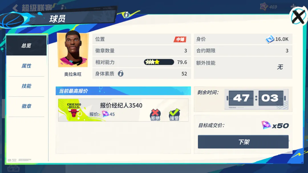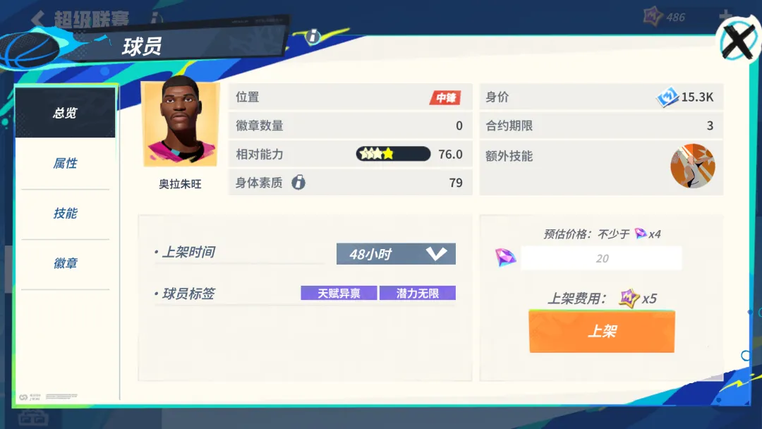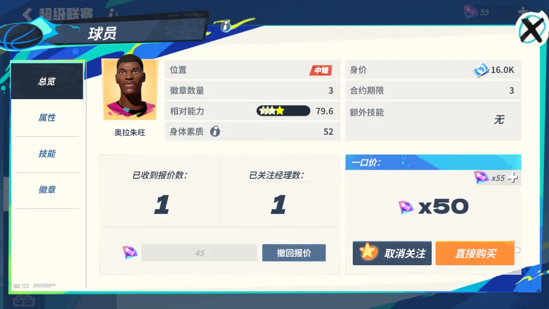每一名球员只能交易一次;一口价设置需高于系统评估价格,每个玩家同时上架球员数量上限为五名。