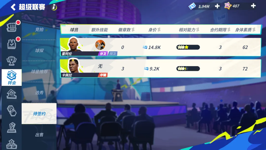 (2)待签约的球员合约还剩最后一个赛季时,玩家可与该球员进行续约,待签约的球员合约到期后会离开球队。