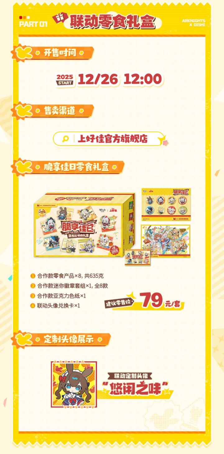 12月26号12点上架零食礼盒,八款零食共计635g。附带亚克力色纸,徽章,头像兑换卡。 79元。