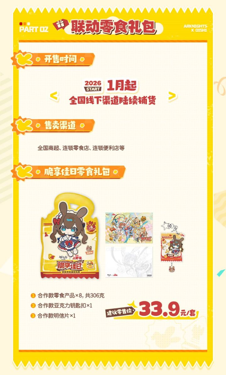 零食礼包。8款零食共计306g。附带明信片和钥匙扣。 33.9元。