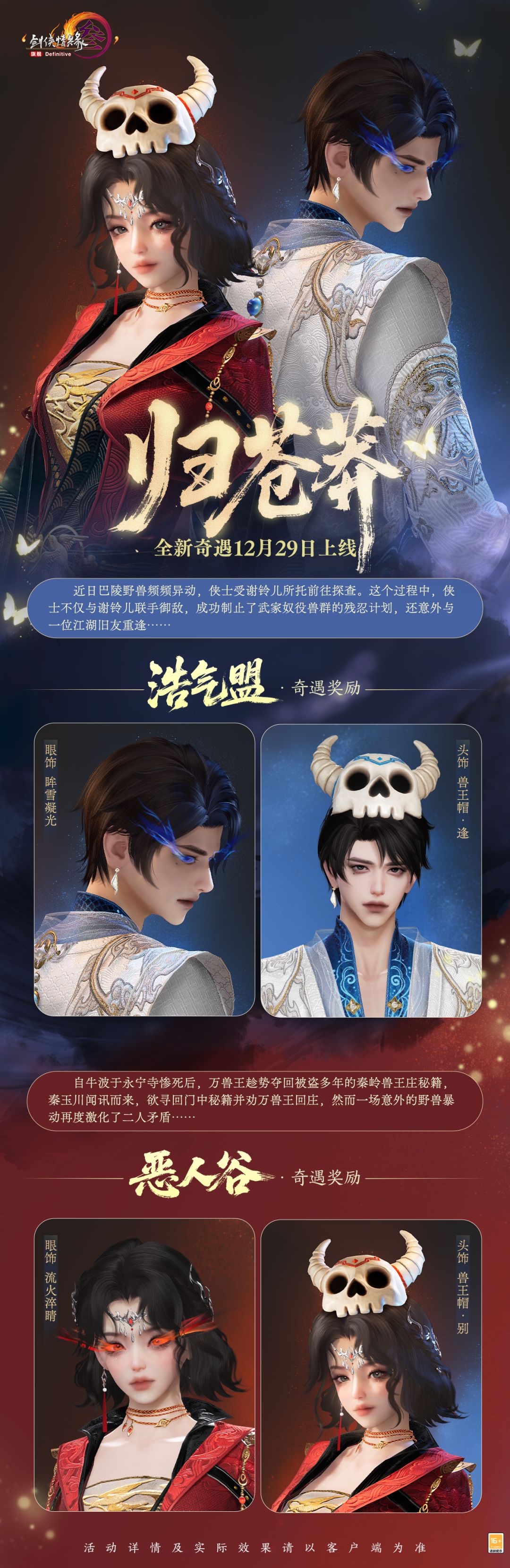 完成奇遇后,侠士将获得所在阵营对应的头饰与眼饰奖励,眸底凝光作刃,头饰野性难羁,自显威赫桀骜!