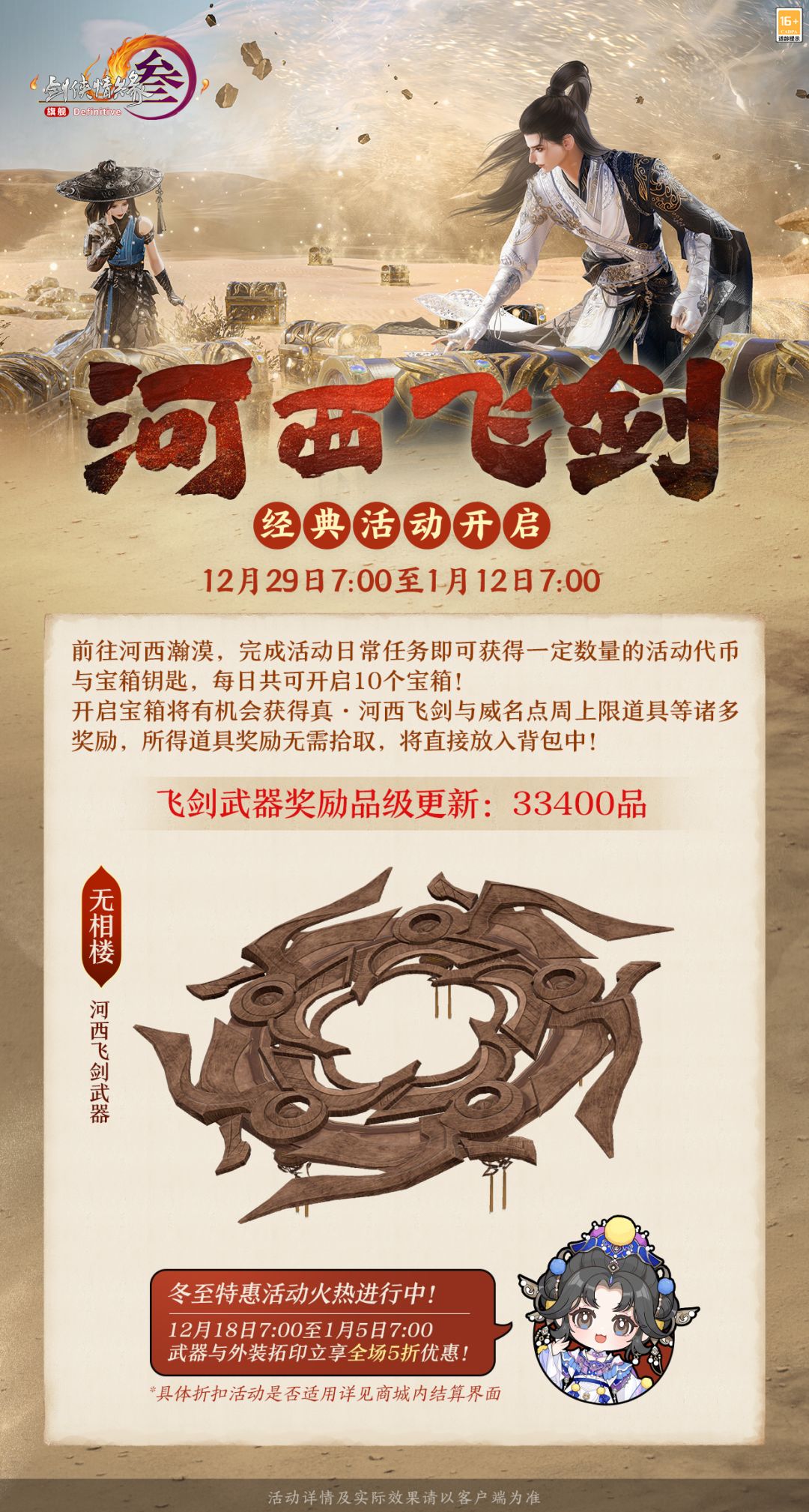 本次真·河西飞剑将为33400品武器,锋芒所向披靡,江湖闯荡无忧!与此同时,冬至特惠活动尚在火热进行中,武器与外装拓印畅享5折特惠,助力焕新侠者风姿!
