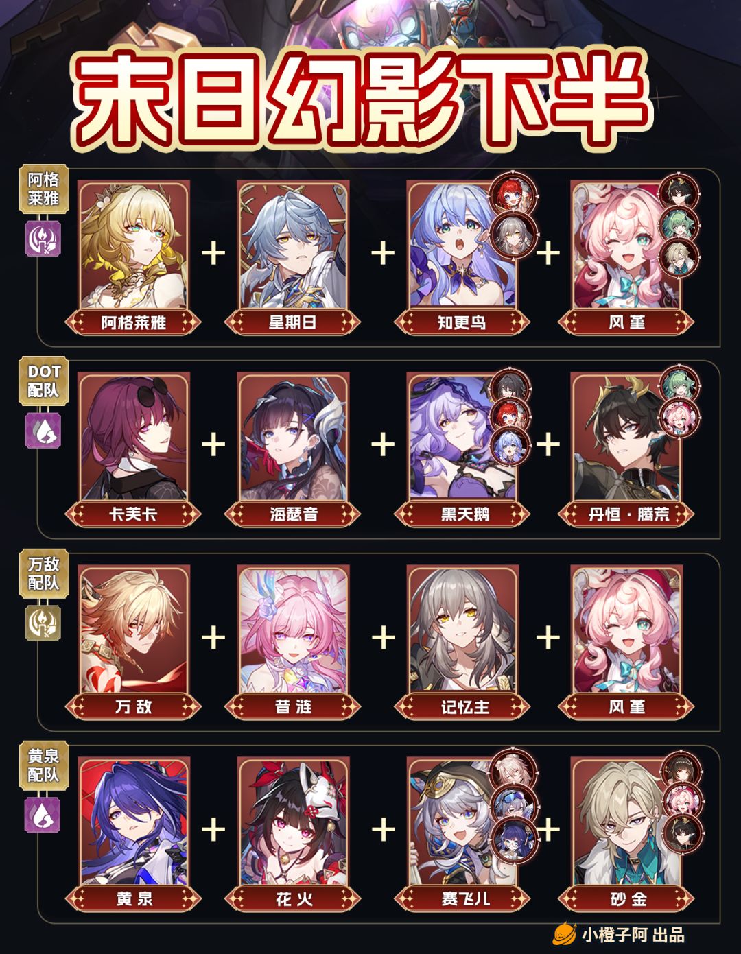 这一期橙子带来了新末日幻影的配队推荐,这一期节点一是【芒寒色正的银骑士】,推荐了8种配队;节点二是【心蕉如火的猴把戏】,推荐了8种配队。