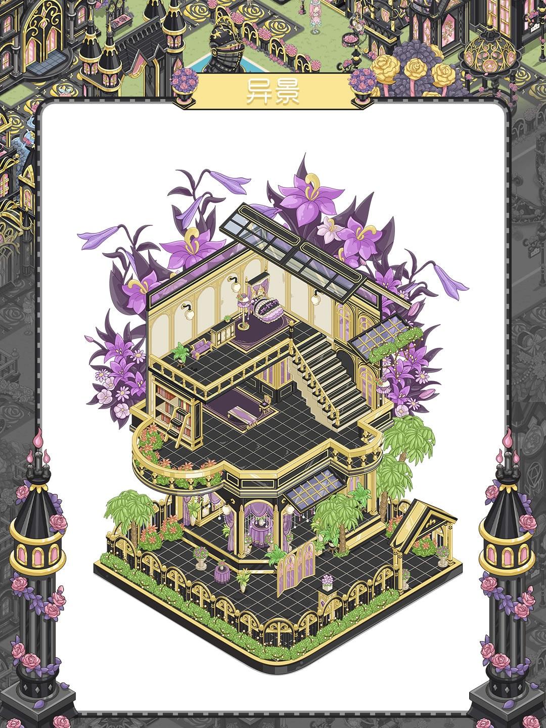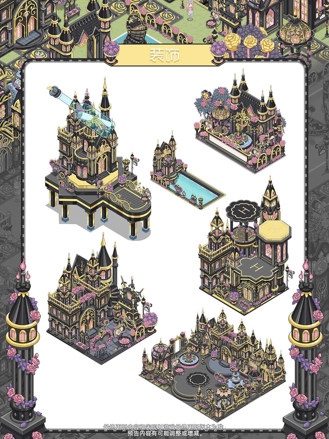 🏰乌金色的城堡外墙泛着绸缎般的光泽,鎏金纹路像藤蔓缠着玫瑰生长,连路灯都要缀满粉紫花簇才肯亮。 巨型玫瑰树淌着金箔花瓣,喷泉溅起的是星屑还是泡泡?连桥栏都蜷着缎带蝴蝶结,每栋建筑都戴着华丽的皇冠~!