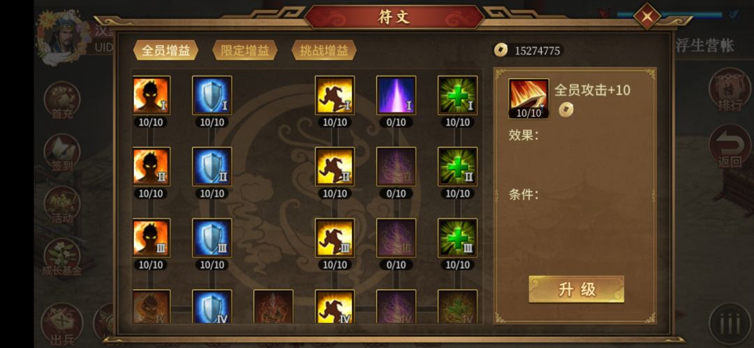 ,天罡有无视距离反+物必+锐+镇卫、万人刘备、雷公(未展示有秘典敏攻40%)。目前历史噩梦8,幻想噩梦1。演武3001,大乱斗800