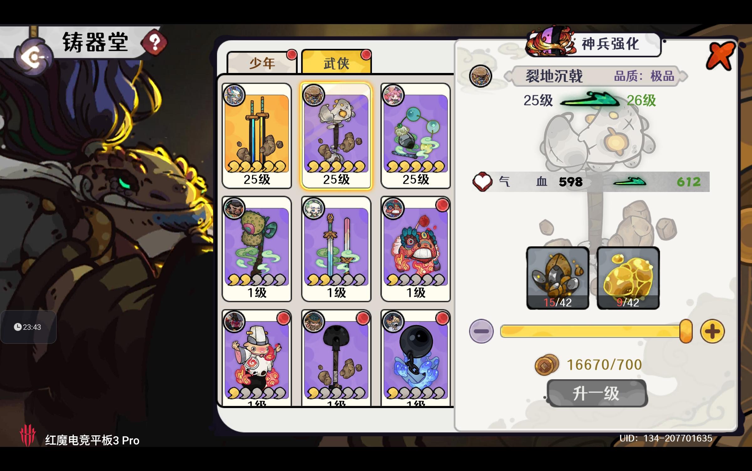 月神开荒第5天,由于昨日账号等级已达25级并解锁关键的神兵强化功能。于是我今天按计划不推主线,反而将精力和体力投入到阵容细节优化上,不断地刷取冥石材料提升神兵等级,将自动剑魔这套阵容神兵等级拉满,剑魔1拖2其他系的等级拉满。