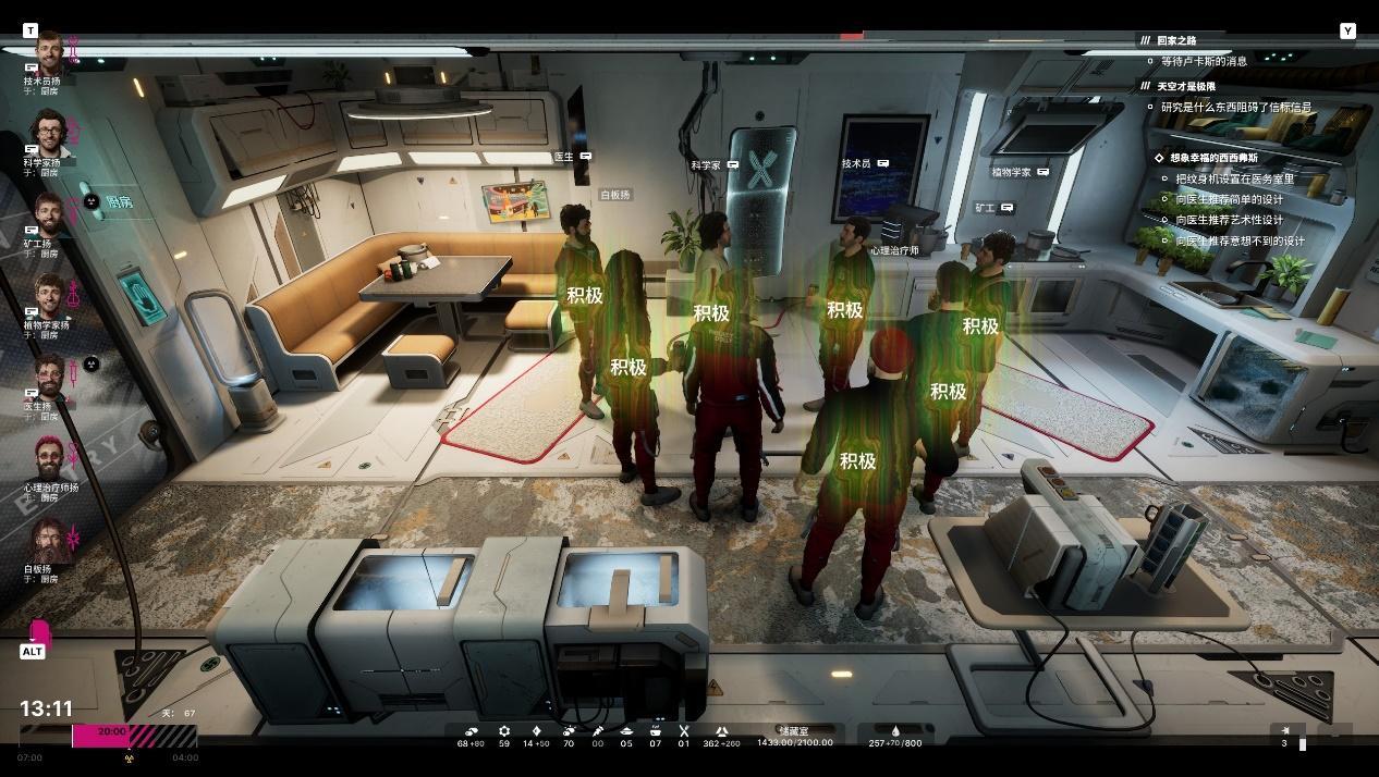 因此技术员和科学家常常为了一些小事争吵,而科学家总是直抒胸臆酣畅淋漓,“我认为这个没有必要”、“那个对任务没有帮助”、“这个简直是浪费时间”。玩家则是需要帮他们提高心情,避免他们因为心情差而减少每天的值班时间。而第二幕最后,11bit拿出了经典的人命与自由二选一。为了拯救所有人的性命,你要么选择牺牲一个刚制造出的傻子的性命,要么选择让所有人暴露在公司的实时定位监控风险下。选择前者,每个人都会遭受良心的谴责,选择后者,就是暂时把性命交到公司手里,说不定哪天就被公司遥控远程杀死了。