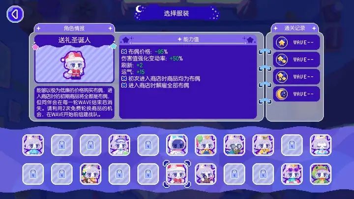 本作没有设置多个角色,取而代之的是让蒂蒂身着不同服装,从圣诞老人到宇航员什么都有,这种换装秀其实也能发挥出相同的效果。不同服装自然会附带着各种增益或减益,与原皮也就是睡衣蒂蒂的体验差距非常大,需要您稍微评估一下,找到自己最满意的那款。事实上会有很多有趣的设计,为您构筑build时提供非常多的启发。至于解锁服装这种事情,我觉得完全不用怎么纠结,反正就这么随便选一种蒂蒂开始游戏,打着打着就能解锁大部分,至于剩下的再稍微看一看条件、进行查漏补缺就完事了。