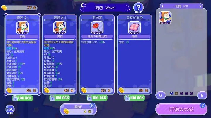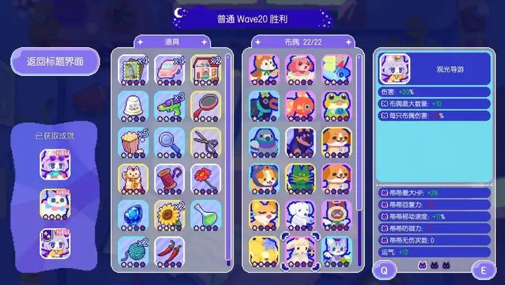 我个人最喜欢的是“观光导游”,该服装能将可操控的布偶数上限提升到20,虽然有每只布偶攻击力略微下降5%的DEBUFF,但这人海战术面前完全不值得一提。事实上通过拾取鬼怪掉落糖果实现人物等级提升后,会有各种选择被动的机会,完全可以堆回来。我个人觉得,选择强化攻击、血量、防御力、复活时间的都很不错。至于商店中的布偶甭管什么类型,看到了就先拿下,把坑填满了再说。当然布偶间会存在着联动,因此如果您有研究的意愿,也可以花点时间去推敲更合理的阵容。