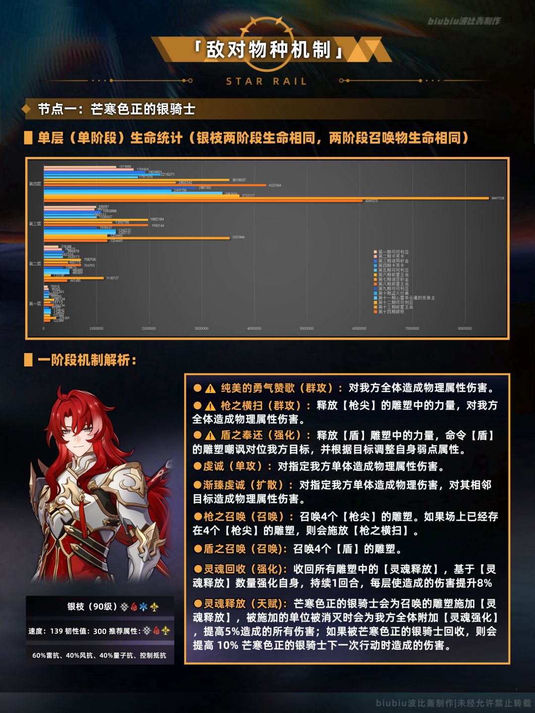 总体来说本期末日幻影的水温相对比较均衡,总生命值相较于上期有大幅的提升,但由于特殊机制因此选取合适的队伍输出效率反而会更高;简单来说就是完整记忆体系与击破体系(需有大丽花才能体验更佳)优势最大的局面,这两种配队很容易就能取得3300以上的分数,至于白厄队与dot队本期上下半也是均能出场的,只是需要有星魂或合适的队友才能取得更高的分数;