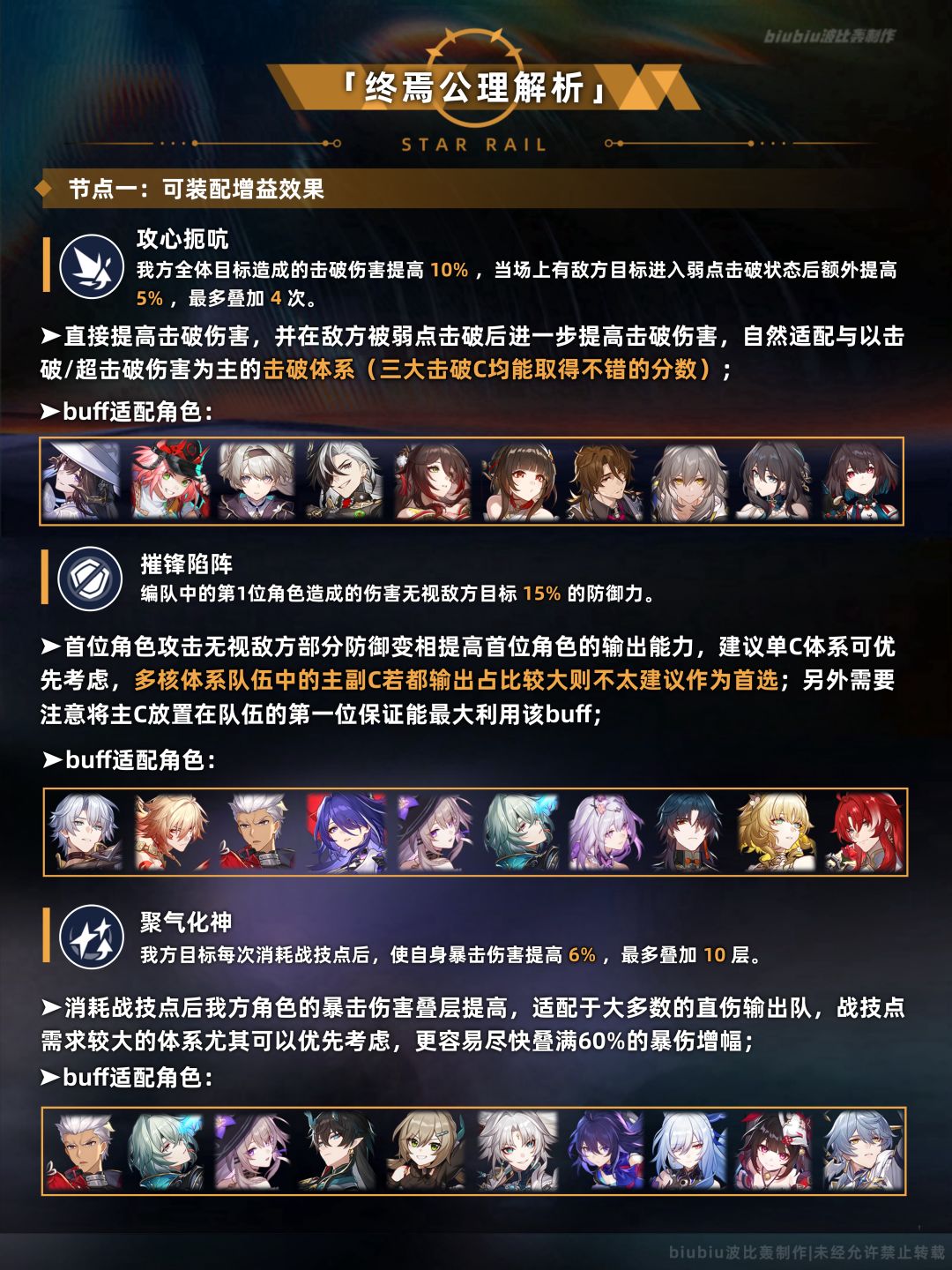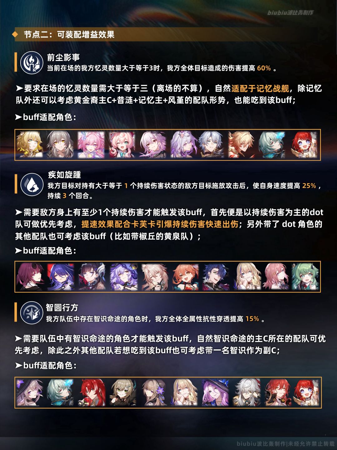 大buff较适合击破与记忆体系,这两种体系在本期也能取得很高的分数;至于上半间的小buff泛用性还可以,注意多核直伤队buff3会优于buff2;再来说一下下半的小buff,有个别配队看似三个buff都是完全吃不到,这样的话就建议优先向大buff靠齐,至于小buff则可以考虑buff2,别忘了击破后也能为敌方挂上持续伤害的,所以多少也能吃到一些,否则的话就要考虑换队友以满足buff1与buff2的要求;
