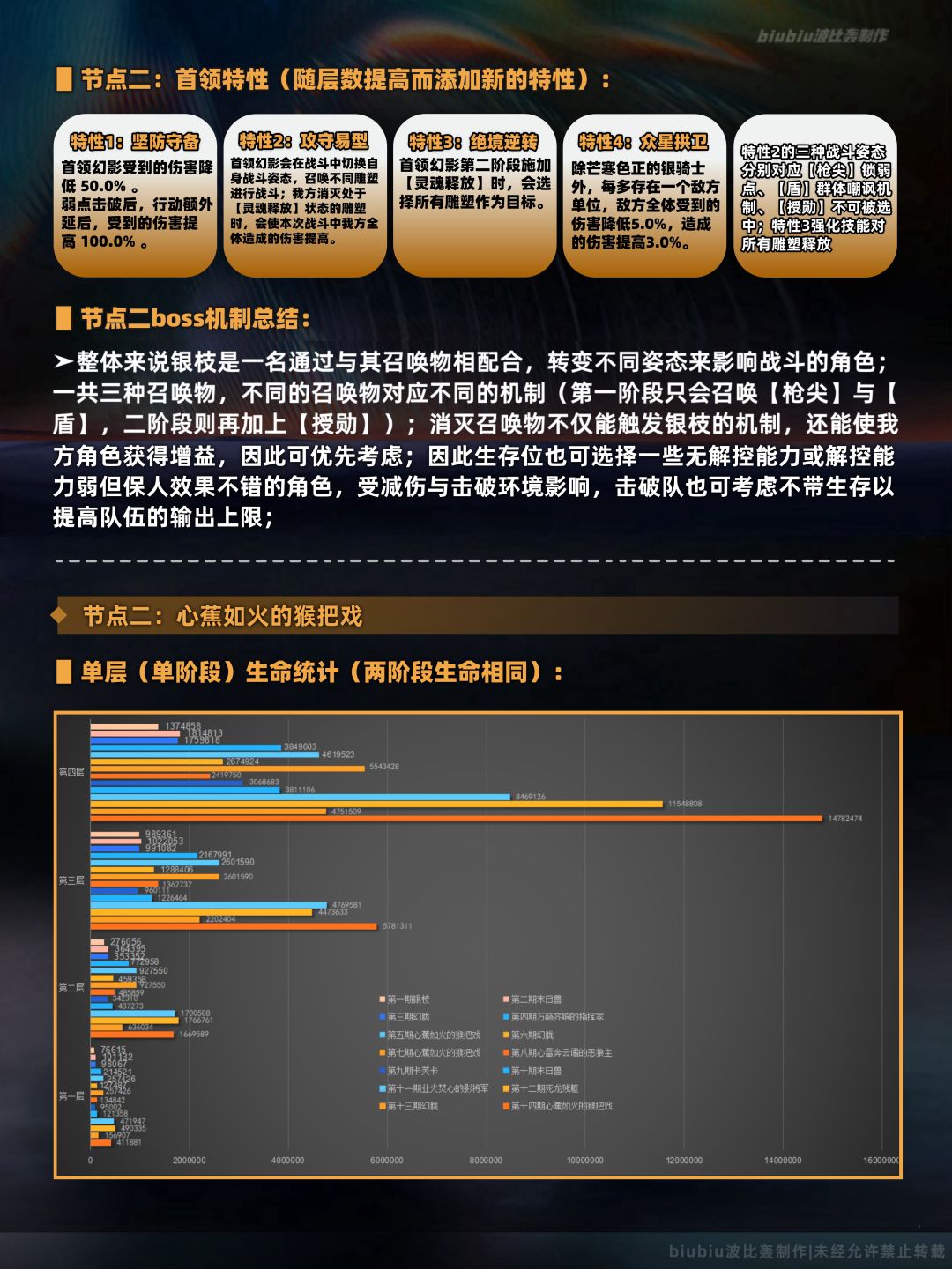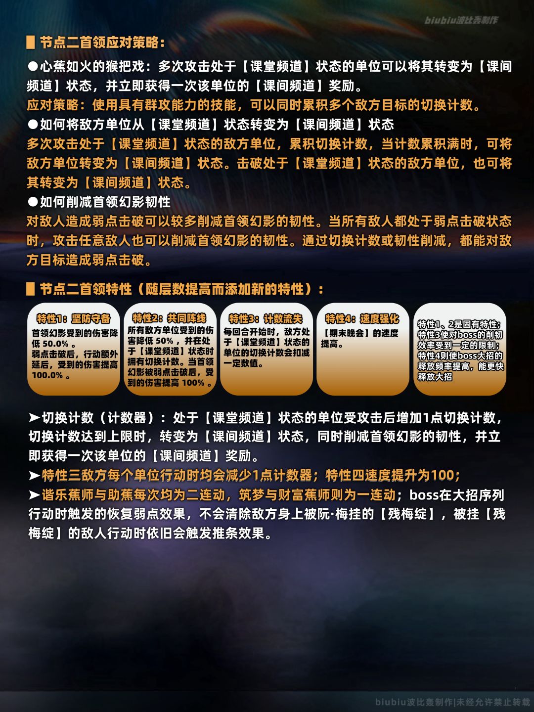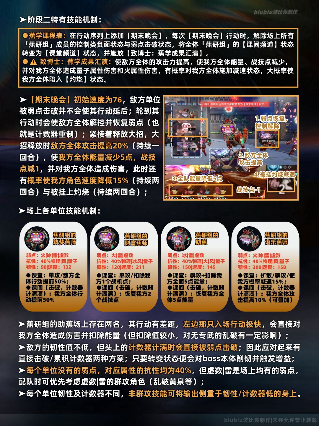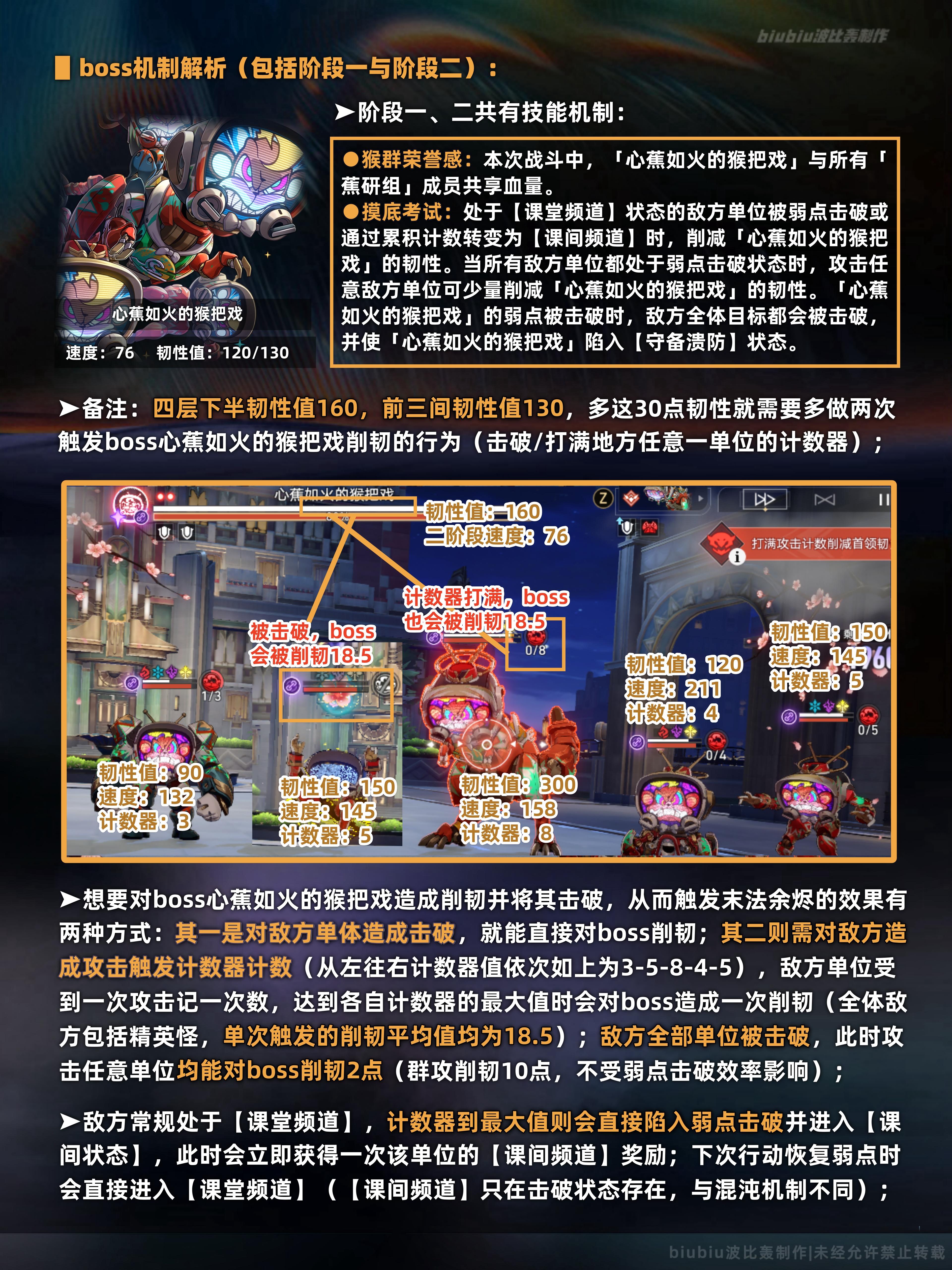 本期上下间的两名敌人我们在往期已经遇到过了,只是生命值较往期有了大幅提升;因此往期能打满的队伍在本期并不一定会取得高分,只有用近期版本新增的角色入队才能跟上输出;简单来说上班间要合理利用敌方的召唤物来使我方获得有利的效果;至于下半的蕉研组则需注意该boss的本体不能被直接击破,需要对场上单体击破或累积计数器达到一定值才能对本体削韧;只有本体削韧完毕才会触发末法余烬,即便把场上所有单体击破也不会触发,单均处于击破状态无论攻击哪个单位都会对本体造成削韧;